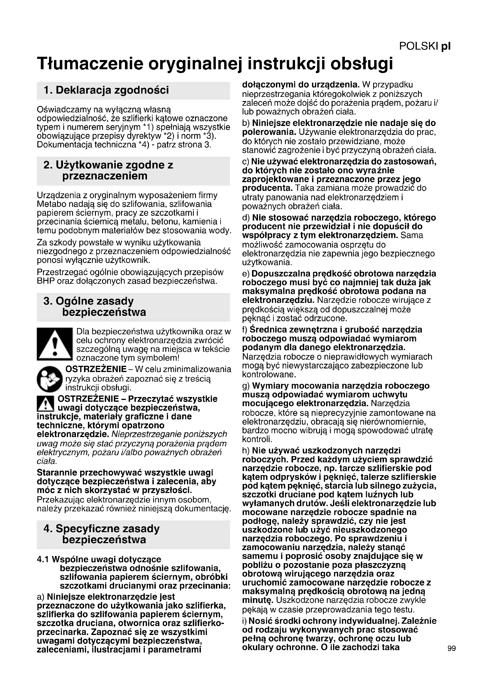 Tłumaczenie oryginalnej instrukcji obsługi Oświadczamy na wyłączną własną odpowiedzialność, że szlifierki kątowe oznaczone typem i numerem seryjnym *1) spełniają wszystkie obowiązujące przepisy dyrektyw *2) i norm *3). Dokumentacja techniczna *4) - patrz strona 3. Urządzenia z oryginalnym wyposażeniem firmy Metabo nadają się do szlifowania, szlifowania papierem ściernym, pracy ze szczotkami i przecinania ściernicą metalu, betonu, kamienia i temu podobnym materiałów bez stosowania wody. Za szkody powstałe w wyniku użytkowania niezgodnego z przeznaczeniem odpowiedzialność ponosi wyłącznie użytkownik. Przestrzegać ogólnie obowiązujących przepisów BHP oraz dołączonych zasad bezpieczeństwa. Dla bezpieczeństwa użytkownika oraz w celu ochrony elektronarzędzia zwrócić szczególną uwagę na miejsca w tekście oznaczone tym symbolem! OSTRZEŻENIE – W celu zminimalizowania ryzyka obrażeń zapoznać się z treścią instrukcji obsługi. OSTRZEŻENIE – Przeczytać wszystkie uwagi dotyczące bezpieczeństwa, instrukcje, materiały graficzne i dane techniczne, którymi opatrzono elektronarzędzie. Nieprzestrzeganie poniższych uwag może się stać przyczyną porażenia prądem elektrycznym, pożaru i/albo poważnych obrażeń ciała. Starannie przechowywać wszystkie uwagi dotyczące bezpieczeństwa i zalecenia, aby móc z nich skorzystać w przyszłości. Przekazując elektronarzędzie innym osobom, należy przekazać również niniejszą dokumentację.
