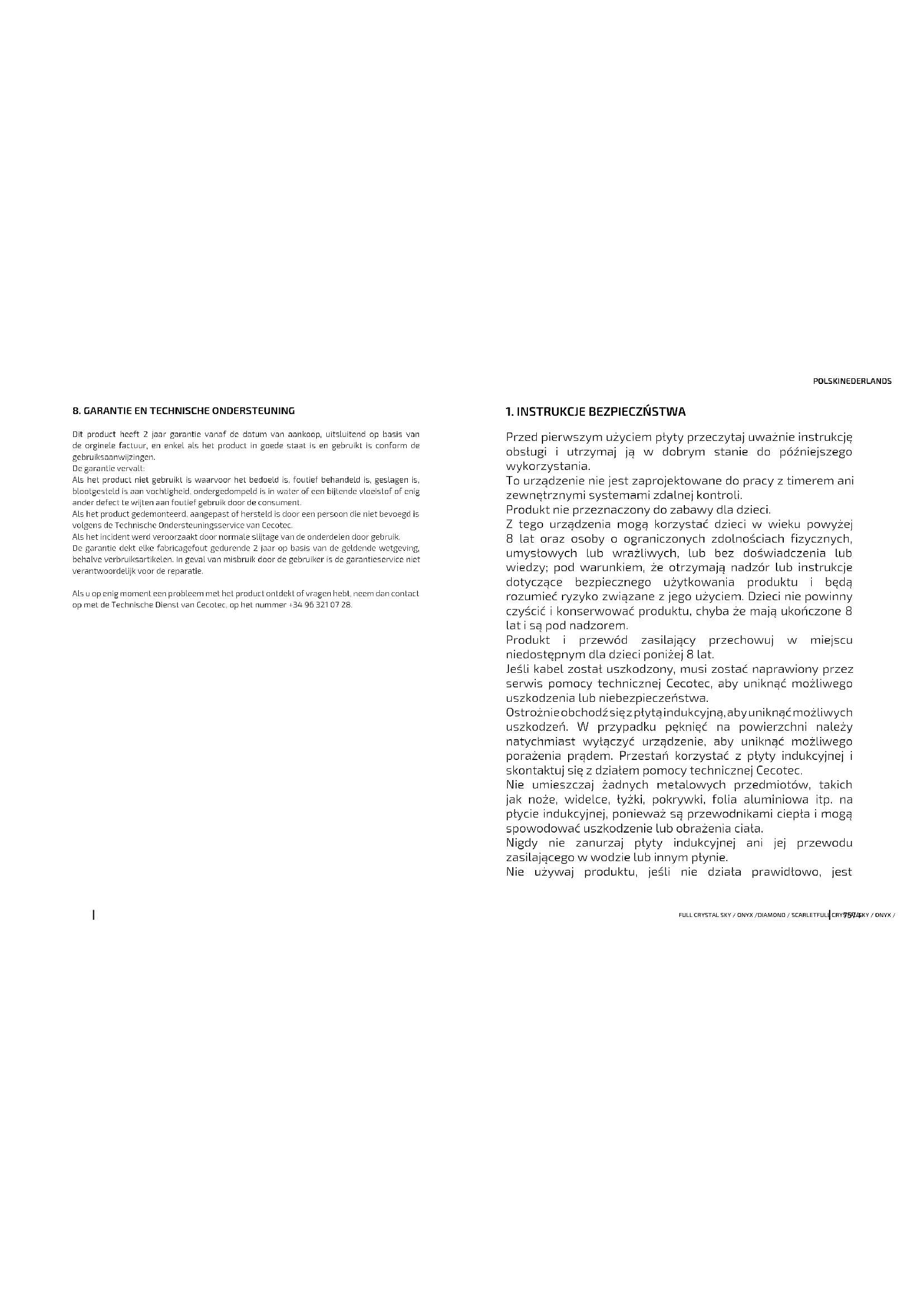 POLSKI POLSKI uszkodzony lub przewód zasilający lub wtyczka są uszkodzone. Ze względów bezpieczeństwa części te muszą zostać wymienione przez serwis pomocy technicznej Cecotec. Wszelkie interwencje w produkcie, oprócz normalnego czyszczenia i konserwacji, muszą być wykonywane przez serwis pomocy technicznej Cecotec. Nigdy nie dotykaj powierzchni urządzenia kiedy jest nagrzane. Części te pozostaną gorące przez pewien czas po użyciu urządzenia. Osoby z rozrusznikami serca lub podobnymi urządzeniami medycznymi powinny trzymać się z dala od płyty indukcyjnej, gdy jest ona podłączona do zasilania. Jeśli masz jakieś pytania na ten temat, skonsultuj się ze swoim lekarzem rodzinnym przed użyciem tego produktu, aby uniknąć możliwych zagrożeń. Uwaga: Płyta indukcyjna będzie gorąca po użyciu. Proszę jej nie dotykać. Ten produkt został stworzony użytku w domu. W przypadku zastosowania profesjonalnego, nieodpowiedniego lub niewskazanego w niniejszej instrukcji, producent nie ponosi odpowiedzialności i gwarancja nie będzie miała zastosowania. Produkt jest przeznaczony do użytku wyłącznie z prądem przemiennym. Przed pierwszym użyciem upewnij się, że napięcie sieciowe odpowiada napięciu podanemu na tabliczce z danymi produktu. Każdy błąd w połączeniu produktu spowoduje utratę gwarancji. Podłączaj urządzenie tylko do uziemionych wtyczek. Nie należy używać adapterów zasilania ani jednocześnie podłączać innych urządzeń do tego samego gniazdka, aby uniknąć przeciążenia elektrycznego i zagrożenia pożarowego. Jeśli używasz urządzenia w kraju innym niż ten, w którym zostało zakupione, upewnij się, że autoryzowane centrum serwisowe sprawdza je prawidłowo, ze względu na różnice w standardach w poszczególnych krajach. Usuń opakowania, naklejki i akcesoria wewnątrz i na zewnątrz produktu. Ustaw urządzenie na płaskiej, stabilnej i odpornej na ciepło powierzchni roboczej, z dala od możliwych rozprysków wody. Nie należy umieszczać ani używać produktu w środowisku o wysokim stopniu wilgotności. Nie umieszczaj ani nie używaj płyty indukcyjnej na powierzchniach stalowych lub aluminiowych. Zachowaj odstęp 10 cm ze wszystkich stron produktu, aby zapewnić odpowiednią wentylację produktu. Nigdy nie umieszczaj ani nie używaj produktu w pobliżu ścian lub pod szafkami ściennymi. Nigdy nie umieszczaj ani nie używaj płyty indukcyjnej pod łatwopalnymi przedmiotami (zasłonami itp.) Lub w ich pobliżu. Nigdy nie umieszczaj ani nie używaj produktu na piecach lub w pobliżu innych źródeł ciepła lub w ich pobliżu. Przed użyciem całkowicie rozwiń przewód zasilający. Nie używaj przedłużaczy. Jeśli akceptujesz obowiązek używania przedłużacza, używaj tylko tego, który jest w dobrym stanie, jest uziemiony i odpowiada wartościom technicznym urządzenia. Nigdy nie zostawiaj produktu, nawet na chwilę, gdy jest podłączony do sieci elektrycznej, zwłaszcza jeśli w pobliżu są obecne dzieci Nie pozwól, aby przewód zasilający wisiał w miejscach, w których dzieci mogą do niego dotrzeć. Przewód zasilający nie może być umieszczany w pobliżu lub w kontakcie z gorącymi częściami produktu, źródłami ciepła lub ostrymi krawędziami. Podejmij niezbędne środki ostrożności, aby uniknąć potknięcia się o przewód zasilający.FULL CRYSTAL SKY / ONYX /DIAMOND / SCARLETFULL CRYSTAL SKY / ONYX /DIAMOND / SCARLET
