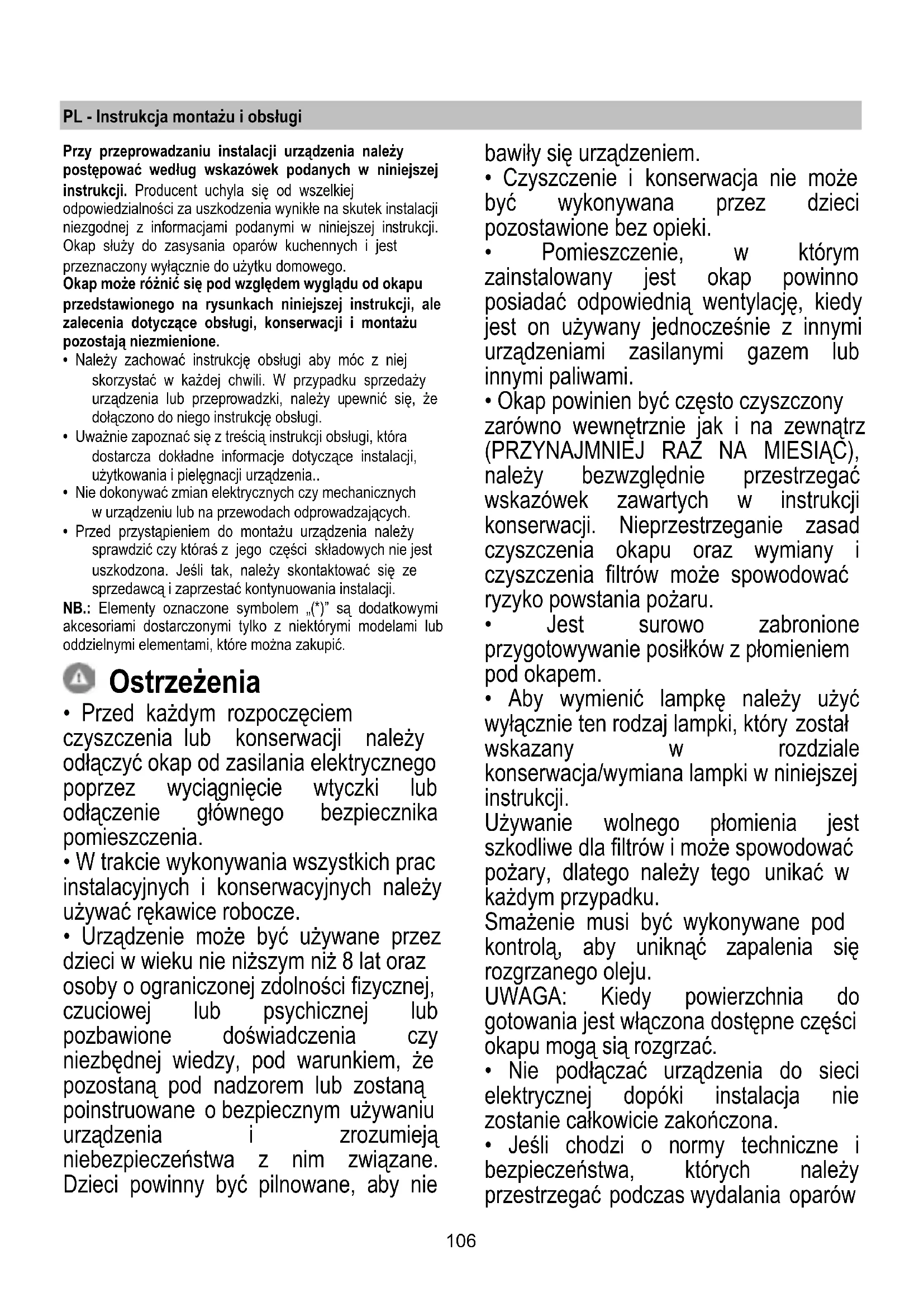 - Okap powinien być często czyszczony zarówno wewnętrznie jak i na zewnątrz (PRZYNAJMNIEJ RAZ NA MIESIĄC), należy bezwzględnie przestrzegać wskazówek zawartych w instrukcji konserwacji. Nieprzestrzeganie zasad czyszczenia okapu oraz wymiany i czyszczenia filtrów może spowodować ryzyko powstania pożaru.