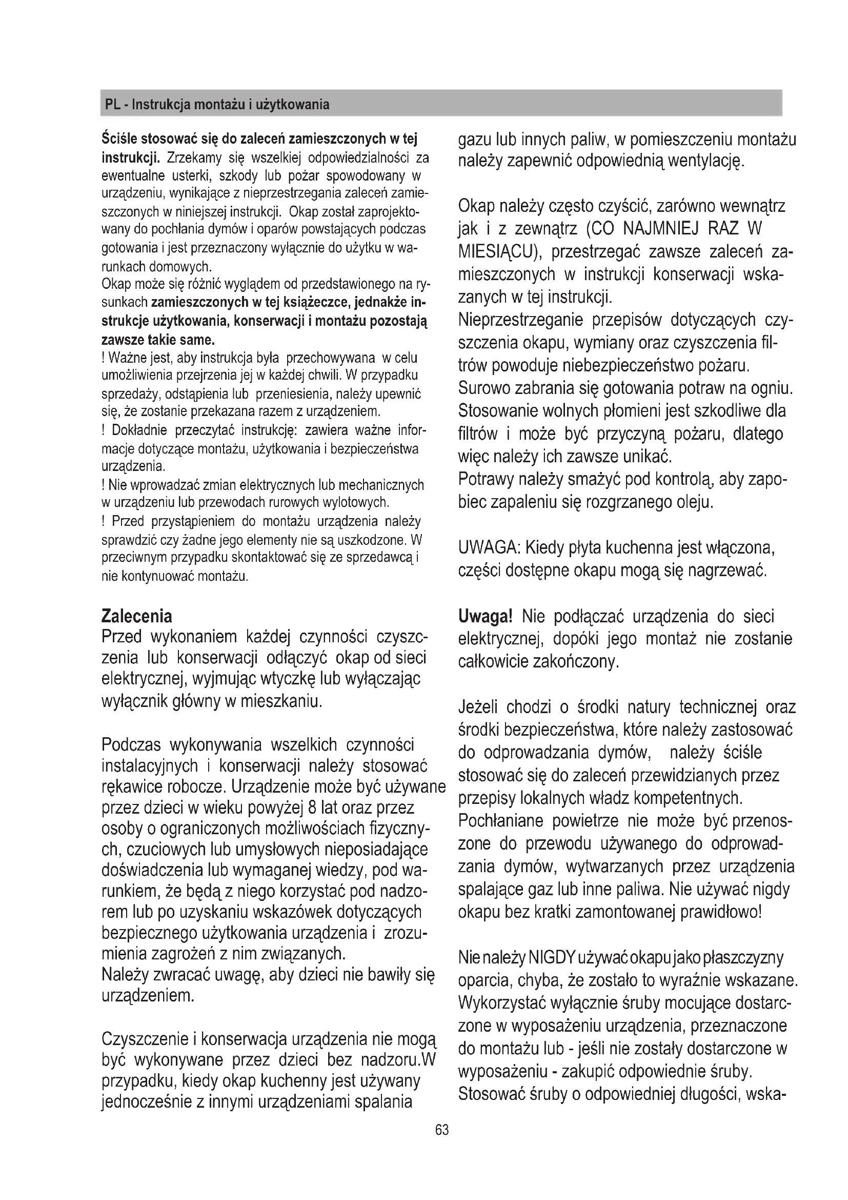 - EMC: EN 55014-1; CISPR 14-1; EN 55014-2; CISPR 14-2; CEI/EN 61000-3-2; CEI/EN 61000-3-3. Wskazówki dotyczące prawidłowego użytkowania w celu zredukowania oddziaływania na środowisko: Po rozpoczęciu gotowania włączyć okap na minimalną prędkość i pozostawić włączony przez kilka minut, nawet po zakończeniu gotowania. Zwiększyć prędkość tylko w przypad- ku dużych ilości dymu i oparów, wykorzystać funkcję booster tylko w krańcowych przypad- kach. Aby utrzymać prawidłową skuteczność systemu redukującego nieprzyjemne zapachy, należy wymieniać - kiedy jest to konieczne - ltr/y węglowy/e. Aby zachować prawidłową wydajność należy czyścić ltr tłuszczowyw razie konieczności. Aby zoptymalizować wydajność i zminimalizować hałas, należy wykorzystać maksymalną średnicę systemu kanalizacji, wskazaną w tej instrukcji. Użytkowanie Okap został zrealizowany do użytku w wersji pochłaniacza z odprowadzaniem na zewnątrz lub w wersji ltrującej z wewnętrzną recyrkulacją. Wersja pochłaniacza Opary są odprowadzane na zewnątrz przez przewód rurowy wylotowy, przymocowany do kołnierza przyłączeniowego. Średnica przewodu wylotowego musi odpowiadać średnicy pierścienia przyłączeniowego. Uwaga! Przewód rurowy odprowadzający nie jest dostarczony i musi zostać zakupiony osob- no. W części poziomej przewód rurowy musi być lekko nachylony do góry (około 10°), w ten sposób umożliwia łatwiejszy przepływ powietr- za na zewnątrz. Jeśli okap jest wyposażony w ltry węglowe, należy je wyjąć.65 Wersja ltrująca Zasysane powietrze jest odtłuszczane przed ponownym wprowadzeniem do pomieszcze- nia. Aby móc używać okap w tej wersji należy zainstalować dodatkowy system ltracyjny na bazie węgli aktywnych. Uwaga: Powietrze poddawane recyrkulacji pr- zez ltry węglowe jest ponownie doprowadzane do pomieszczenia kuchennego przez przewód rurowy, który przenosi je do odpowiedniej stro- ny szafki. Instalacja Uwaga: instalacja urządzenia musi być przepro- wadzona w taki sposób, aby był zawsze gwaran- towany dostęp do okapu i komponentów elektro- nicznych, w celu przeprowadzenia ewentualnych interwencji w ramach serwisu technicznego. WSKAZÓWKA: Umieścić metalowy pojemnik zawierający elektroniczne elementy w odległości nie mniejszej niż 65 cm od płyty gazowej lub w każdym razie 65 cm od punktu pochłaniania okapu. ZALECENIE: Zalecamy zamontować meta- lowy pojemnik z elektronicznymi elementami na wysokości co najmniej 10 cm od podłoża i w odpowiedniej odległości od źródeł ciepła (np: ścianka piekarnika lub płyta kuchenna). Jeśli w instrukcjach montażowych płyty gazo- wej podana jest większa odległość, należy je uwzględnić. Połączenie elektryczne Podłączenie okapu do sieci elektrycznej musi być wykonane przez personel techniczny odpowied- nio wykwalikowany i wyspecjalizowany. Napięcie sieci musi odpowiadać wartościom napięcia podanym na etykiecie parametrów umieszczonej wewnątrz okapu. Jeśli okap jest wyposażony we wtyczkę, należy podłączyć ją do gniazdka zgodnego z obowiązującymi przepisami, które musi znajdować się w miejscu dostępnym, nawet po jego zainstalowaniu. Jeśli okap nie po- siada wtyczki (bezpośrednie podłączenie do sieci) lub wtyczka znajduje się w miejscu niedostępnym, nawet po jego zainstalowaniu, należy zastosować wyłącznik dwubiegunowy zgodny z przepisami, który będzie gwarantować całkowite odłączenie od sieci w warunkach III kategorii przepięcia, zgodnie z przepisami dotyczącymi instalacji. Uwaga! Przed ponownym podłączeniem okapu do zasilania sieciowego i sprawdzeniem prawidłowego funkcjonowania, należy zawsze sprawdzić czy pr- zewód sieciowy został prawidłowo zamontowany. Montaż Przed rozpoczęciem montażu urządzenia należy sprawdzić czy żaden element nie uległ uszkodzeniu, w przeciwnym przypad- ku należy skontaktować się ze sprzedawcą i nie kontynuować instalacji. Ponadto należy dokładnie przeczytać wszelkie instrukcje zamie- szczone niżej. Zastosować przewód rurowy odprowadzający powietrze o długości maksymalnej nieprzekraczającej 5 metrów.