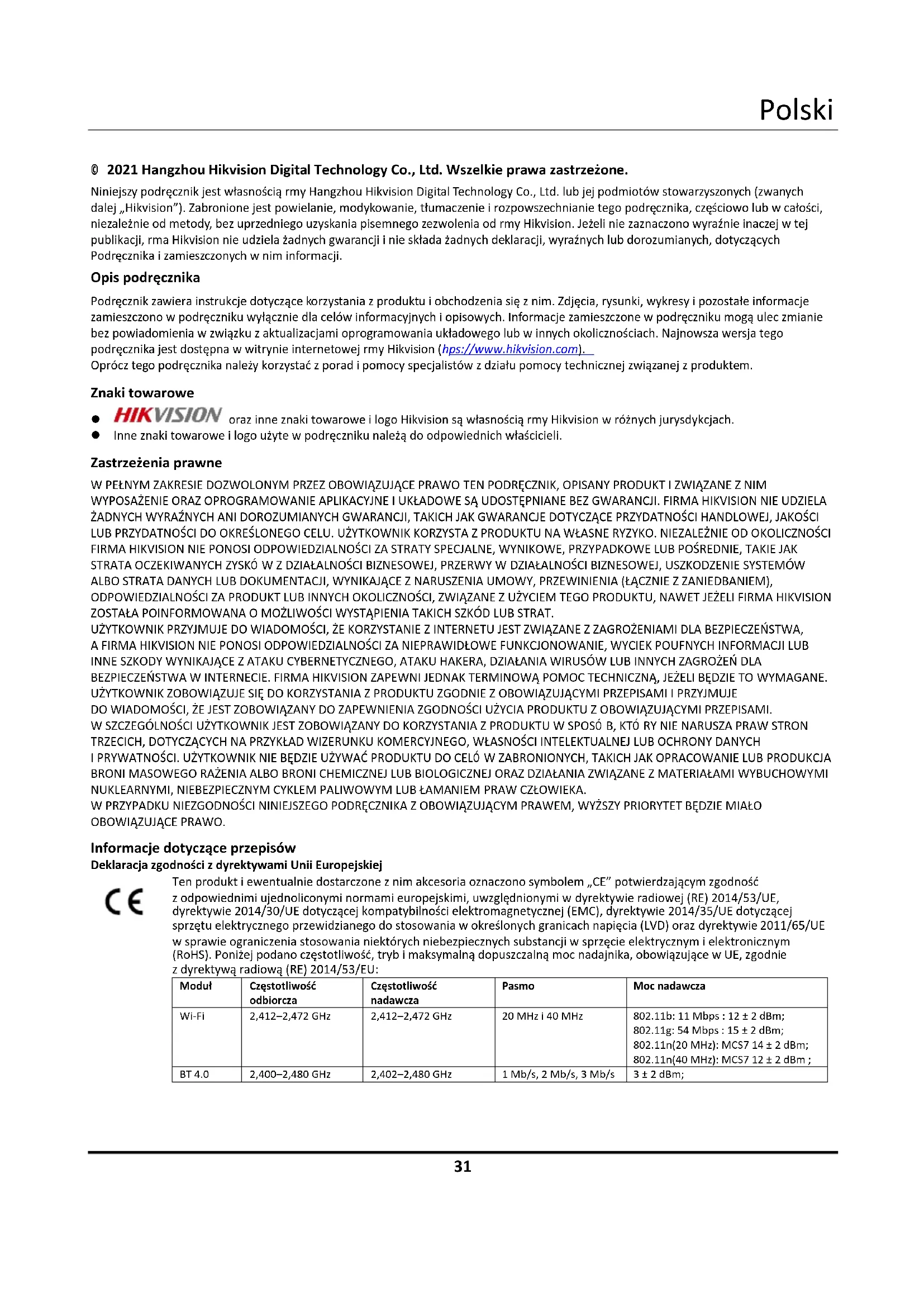 © 2021 Hangzhou Hikvision Digital Technology Co., Ltd. Wszelkie prawa zastrzeżone. Niniejszy podręcznik jest własnością firmy Hangzhou Hikvision Digital Technology Co., Ltd. lub jej podmiotów stowarzyszonych (zwanych dalej „Hikvision”). Zabronione jest powielanie, modyfikowanie, tłumaczenie i rozpowszechnianie tego podręcznika, częściowo lub w całości, niezależnie od metody, bez uprzedniego uzyskania pisemnego zezwolenia od firmy Hikvision. Jeżeli nie zaznaczono wyraźnie inaczej w tej publikacji, firma Hikvision nie udziela żadnych gwarancji i nie składa żadnych deklaracji, wyraźnych lub dorozumianych, dotyczących Podręcznika i zamieszczonych w nim informacji. Opis podręcznika Podręcznik zawiera instrukcje dotyczące korzystania z produktu i obchodzenia się z nim. Zdjęcia, rysunki, wykresy i pozostałe informacje zamieszczono w podręczniku wyłącznie dla celów informacyjnych i opisowych. Informacje zamieszczone w podręczniku mogą ulec zmianie bez powiadomienia w związku z aktualizacjami oprogramowania układowego lub w innych okolicznościach. Najnowsza wersja tego podręcznika jest dostępna w witrynie internetowej firmy Hikvision (https://www.hikvision.com). Oprócz tego podręcznika należy korzystać z porad i pomocy specjalistów z działu pomocy technicznej związanej z produktem. Znaki towarowe oraz inne znaki towarowe i logo Hikvision są własnością firmy Hikvision w różnych jurysdykcjach. Inne znaki towarowe i logo użyte w podręczniku należą do odpowiednich właścicieli. Zastrzeżenia prawne W PEŁNYM ZAKRESIE DOZWOLONYM PRZEZ OBOWIĄZUJĄCE PRAWO TEN PODRĘCZNIK, OPISANY PRODUKT I ZWIĄZANE Z NIM WYPOSAŻENIE ORAZ OPROGRAMOWANIE APLIKACYJNE I UKŁADOWE SĄ UDOSTĘPNIANE BEZ GWARANCJI. FIRMA HIKVISION NIE UDZIELA ŻADNYCH WYRAŹNYCH ANI DOROZUMIANYCH GWARANCJI, TAKICH JAK GWARANCJE DOTYCZĄCE PRZYDATNOŚCI HANDLOWEJ, JAKOŚCI LUB PRZYDATNOŚCI DO OKREŚLONEGO CELU. UŻYTKOWNIK KORZYSTA Z PRODUKTU NA WŁASNE RYZYKO. NIEZALEŻNIE OD OKOLICZNOŚCI FIRMA HIKVISION NIE PONOSI ODPOWIEDZIALNOŚCI ZA STRATY SPECJALNE, WYNIKOWE, PRZYPADKOWE LUB POŚREDNIE, TAKIE JAK STRATA OCZEKIWANYCH ZYSKÓ W Z DZIAŁALNOŚCI BIZNESOWEJ, PRZERWY W DZIAŁALNOŚCI BIZNESOWEJ, USZKODZENIE SYSTEMÓW ALBO STRATA DANYCH LUB DOKUMENTACJI, WYNIKAJĄCE Z NARUSZENIA UMOWY, PRZEWINIENIA (ŁĄCZNIE Z ZANIEDBANIEM), ODPOWIEDZIALNOŚCI ZA PRODUKT LUB INNYCH OKOLICZNOŚCI, ZWIĄZANE Z UŻYCIEM TEGO PRODUKTU, NAWET JEŻELI FIRMA HIKVISION ZOSTAŁA POINFORMOWANA O MOŻLIWOŚCI WYSTĄPIENIA TAKICH SZKÓD LUB STRAT. UŻYTKOWNIK PRZYJMUJE DO WIADOMOŚCI, ŻE KORZYSTANIE Z INTERNETU JEST ZWIĄZANE Z ZAGROŻENIAMI DLA BEZPIECZEŃSTWA, A FIRMA HIKVISION NIE PONOSI ODPOWIEDZIALNOŚCI ZA NIEPRAWIDŁOWE FUNKCJONOWANIE, WYCIEK POUFNYCH INFORMACJI LUB INNE SZKODY WYNIKAJĄCE Z ATAKU CYBERNETYCZNEGO, ATAKU HAKERA, DZIAŁANIA WIRUSÓW LUB INNYCH ZAGROŻEŃ DLA BEZPIECZEŃSTWA W INTERNECIE. FIRMA HIKVISION ZAPEWNI JEDNAK TERMINOWĄ POMOC TECHNICZNĄ, JEŻELI BĘDZIE TO WYMAGANE. UŻYTKOWNIK ZOBOWIĄZUJE SIĘ DO KORZYSTANIA Z PRODUKTU ZGODNIE Z OBOWIĄZUJĄCYMI PRZEPISAMI I PRZYJMUJE DO WIADOMOŚCI, ŻE JEST ZOBOWIĄZANY DO ZAPEWNIENIA ZGODNOŚCI UŻYCIA PRODUKTU Z OBOWIĄZUJĄCYMI PRZEPISAMI. W SZCZEGÓLNOŚCI UŻYTKOWNIK JEST ZOBOWIĄZANY DO KORZYSTANIA Z PRODUKTU W SPOSÓ B, KTÓ RY NIE NARUSZA PRAW STRON TRZECICH, DOTYCZĄCYCH NA PRZYKŁAD WIZERUNKU KOMERCYJNEGO, WŁASNOŚCI INTELEKTUALNEJ LUB OCHRONY DANYCH I PRYWATNOŚCI. UŻYTKOWNIK NIE BĘDZIE UŻYWAĆ PRODUKTU DO CELÓ W ZABRONIONYCH, TAKICH JAK OPRACOWANIE LUB PRODUKCJA BRONI MASOWEGO RAŻENIA ALBO BRONI CHEMICZNEJ LUB BIOLOGICZNEJ ORAZ DZIAŁANIA ZWIĄZANE Z MATERIAŁAMI WYBUCHOWYMI NUKLEARNYMI, NIEBEZPIECZNYM CYKLEM PALIWOWYM LUB ŁAMANIEM PRAW CZŁOWIEKA. W PRZYPADKU NIEZGODNOŚCI NINIEJSZEGO PODRĘCZNIKA Z OBOWIĄZUJĄCYM PRAWEM, WYŻSZY PRIORYTET BĘDZIE MIAŁO OBOWIĄZUJĄCE PRAWO. Informacje dotyczące przepisów Deklaracja zgodności z dyrektywami Unii Europejskiej