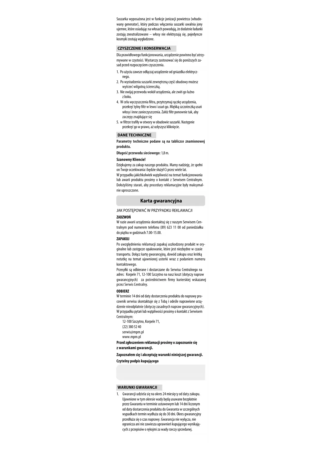 ZADZWOŃ W razie awarii urządzenia skontaktuj się z naszym Serwisem Cen- tralnym pod numerem telefonu (89) 623 11 00 od poniedziałku do piątku w godzinach 7.00-15.00. ZAPAKUJ Po uwzględnieniu reklamacji zapakuj uszkodzony produkt w ory- ginalne lub zastępcze opakowanie, które jest niezbędne w czasie transportu. Dołącz kartę gwarancyjną, dowód zakupu oraz krótką notatkę na temat ujawnionej usterki wraz z podaniem numeru kontaktowego. Przesyłki są odbierane i dostarczane do Serwisu Centralnego na adres: Korpele 71, 12-100 Szczytno na nasz koszt (dotyczy napraw gwarancyjnych) za pośrednictwem firmy kurierskiej wskazanej przez Serwis Centralny. ODBIERZ W terminie 14 dni od daty dostarczenia produktu do naprawy pra- cownik serwisu skontaktuje się z Tobą i odeśle naprawione urzą- dzenie nieodpłatnie (dotyczy zasadnych napraw gwarancyjnych). W przypadku pytań lub wątpliwości prosimy o kontakt z Serwisem Centralnym: 12-100 Szczytno, Korpele 71, (22) 380 52 40 serwis@mpm.pl www.mpm.pl Przed zgłoszeniem reklamacji prosimy o zapoznanie się z warunkami gwarancji. Zapoznałem się i akceptuję warunki niniejszej gwarancji. Czytelny podpis kupującego WARUNKI GWARANCJI