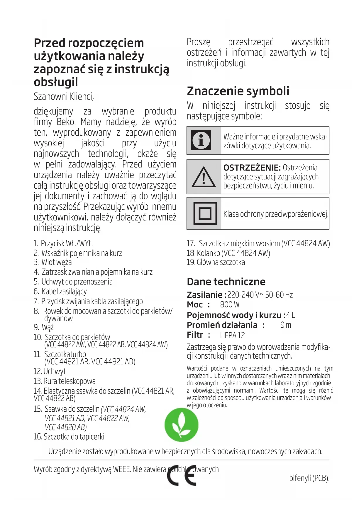 VCC 44822 AW - Odkurzacz BEKO - Bezpłatna instrukcja obsługi
