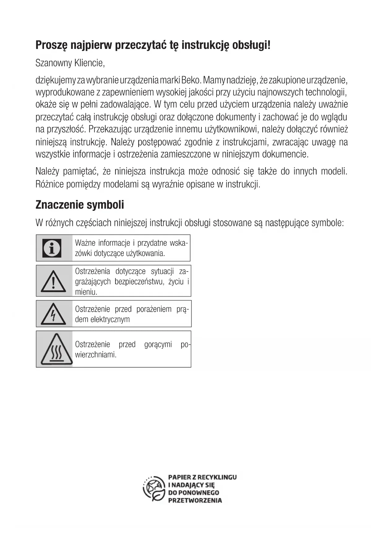 - La caduta dell’apparecchio ne causerà il mal- funzionamento o potrebbe essere causa di danni permanenti.www.grundig.itProszę najpierw przeczytać tę instrukcję obsługi! Szanowny Kliencie, dziękujemy za wybranie urządzenia marki Beko. Mamy nadzieję, że zakupione urządzenie, wyprodukowane z zapewnieniem wysokiej jakości przy użyciu najnowszych technologii, okaże się w pełni zadowalające. W tym celu przed użyciem urządzenia należy uważnie przeczytać całą instrukcję obsługi oraz dołączone dokumenty i zachować je do wglądu na przyszłość. Przekazując urządzenie innemu użytkownikowi, należy dołączyć również niniejszą instrukcję. Należy postępować zgodnie z instrukcjami, zwracając uwagę na wszystkie informacje i ostrzeżenia zamieszczone w niniejszym dokumencie. Należy pamiętać, że niniejsza instrukcja może odnosić się także do innych modeli. Różnice pomiędzy modelami są wyraźnie opisane w instrukcji. Znaczenie symboli W różnych częściach niniejszej instrukcji obsługi stosowane są następujące symbole: