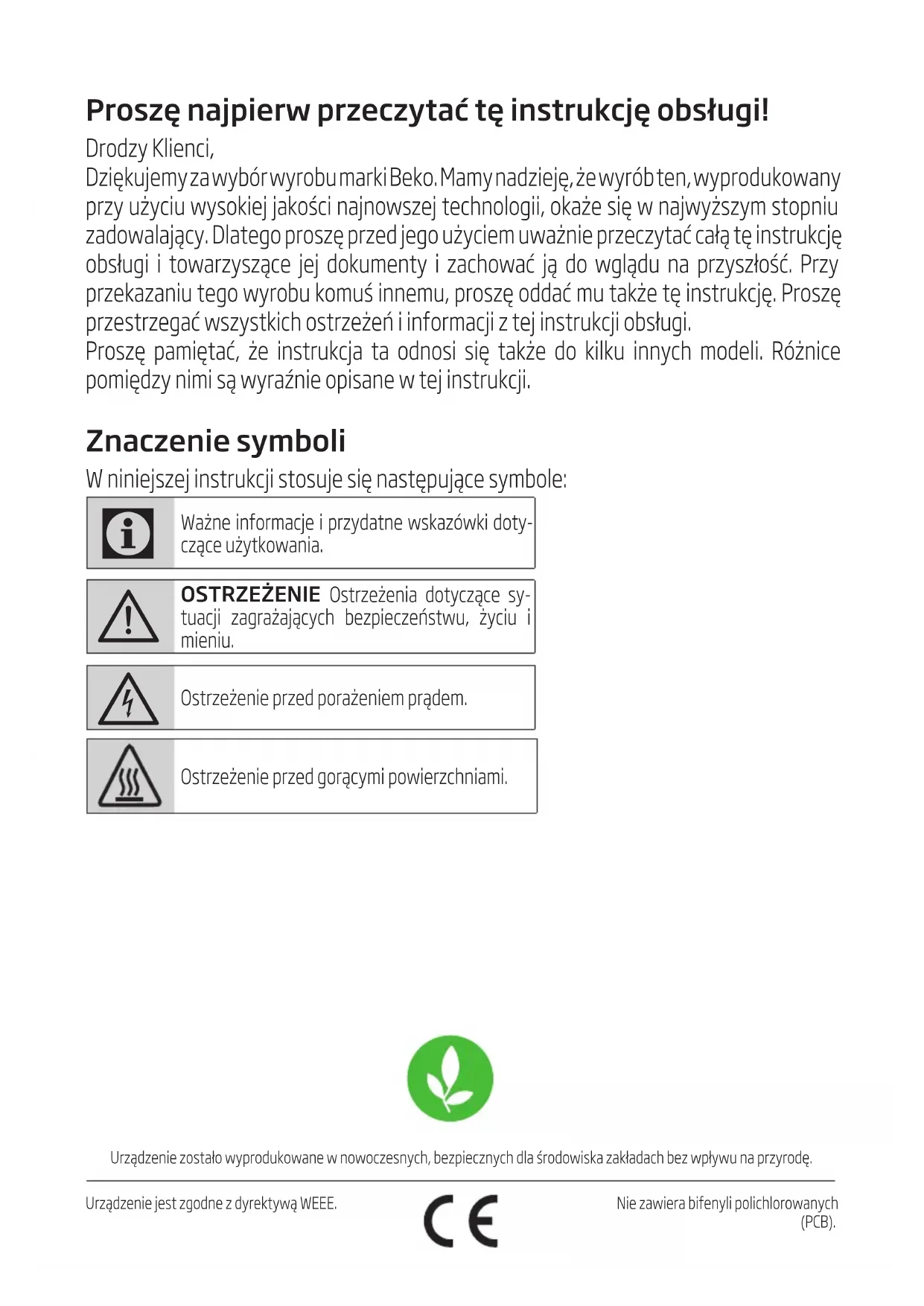 - Do not place any objects on the hood.•Protecttheoutersurfacefromimpacts.•Pack the appliance so that it would not be damaged during transport.Urządzenie zostało wyprodukowane w nowoczesnych, bezpiecznych dla środowiska zakładach bez wpływu na przyrodę.Urządzenie jest zgodne z dyrektywą WEEE.Nie zawiera bifenyli polichlorowanych (PCB). Proszę najpierw przeczytać tę instrukcję obsługi! Drodzy Klienci, Dziękujemy za wybór wyrobu marki Beko. Mamy nadzieję, że wyrób ten, wyprodukowany przy użyciu wysokiej jakości najnowszej technologii, okaże się w najwyższym stopniu zadowalający. Dlatego proszę przed jego użyciem uważnie przeczytać całą tę instrukcję obsługi i towarzyszące jej dokumenty i zachować ją do wglądu na przyszłość. Przy przekazaniu tego wyrobu komuś innemu, proszę oddać mu także tę instrukcję. Proszę przestrzegać wszystkich ostrzeżeń i informacji z tej instrukcji obsługi. Proszę pamiętać, że instrukcja ta odnosi się także do kilku innych modeli. Różnice pomiędzy nimi są wyraźnie opisane w tej instrukcji. Znaczenie symboli W niniejszej instrukcji stosuje się następujące symbole: