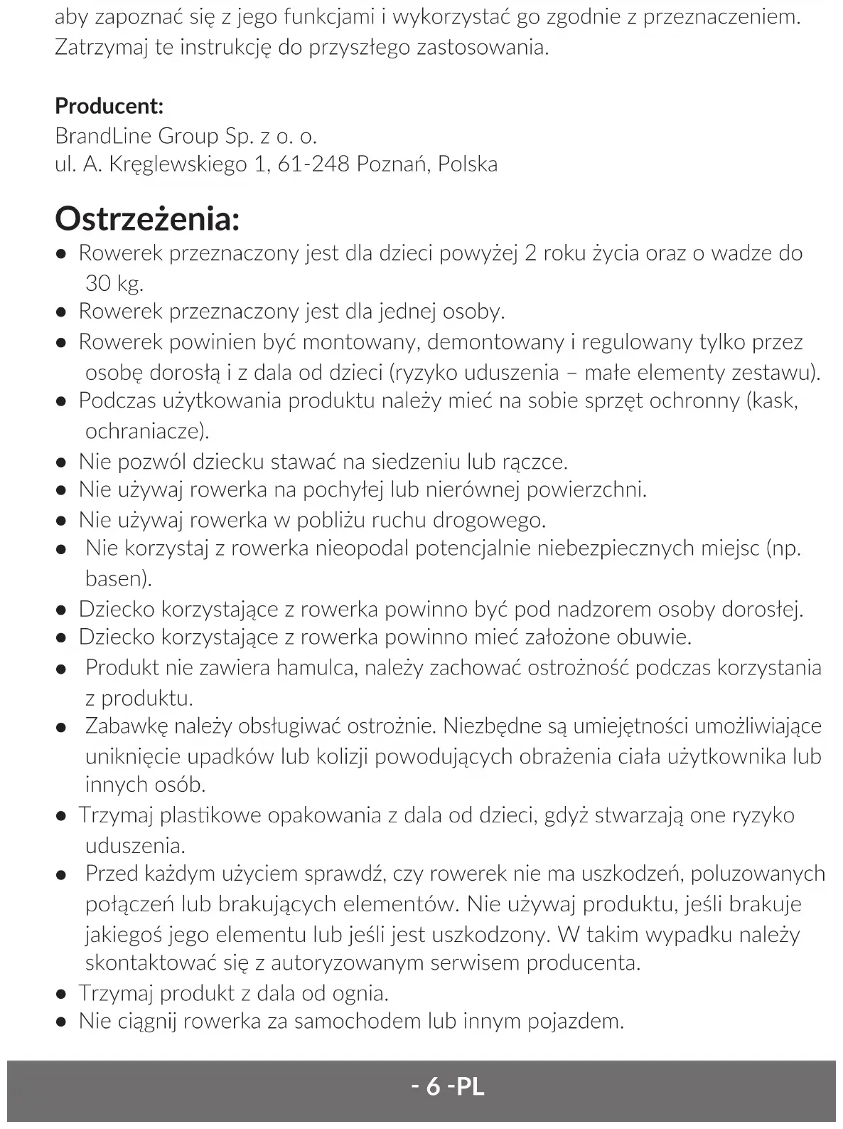 Przed każdym użyciem sprawdź, czy rowerek nie ma uszkodzeń, poluzowanych połączeń lub brakujących elementów. Nie używaj produktu, jeśli brakuje jakiegoś jego elementu lub jeśli jest uszkodzony. W takim wypadku należy skontaktować się z autoryzowanym serwisem producenta.