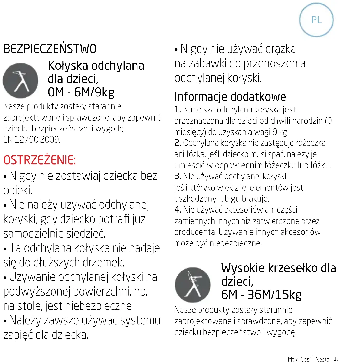 BEZPIECZEŃSTWO Kołyska odchylana dla dzieci, 0M - 6M/9kg Nasze produkty zostały starannie zaprojektowane i sprawdzone, aby zapewnić dziecku bezpieczeństwo i wygodę. EN 12790:2009. OSTRZEŻENIE: