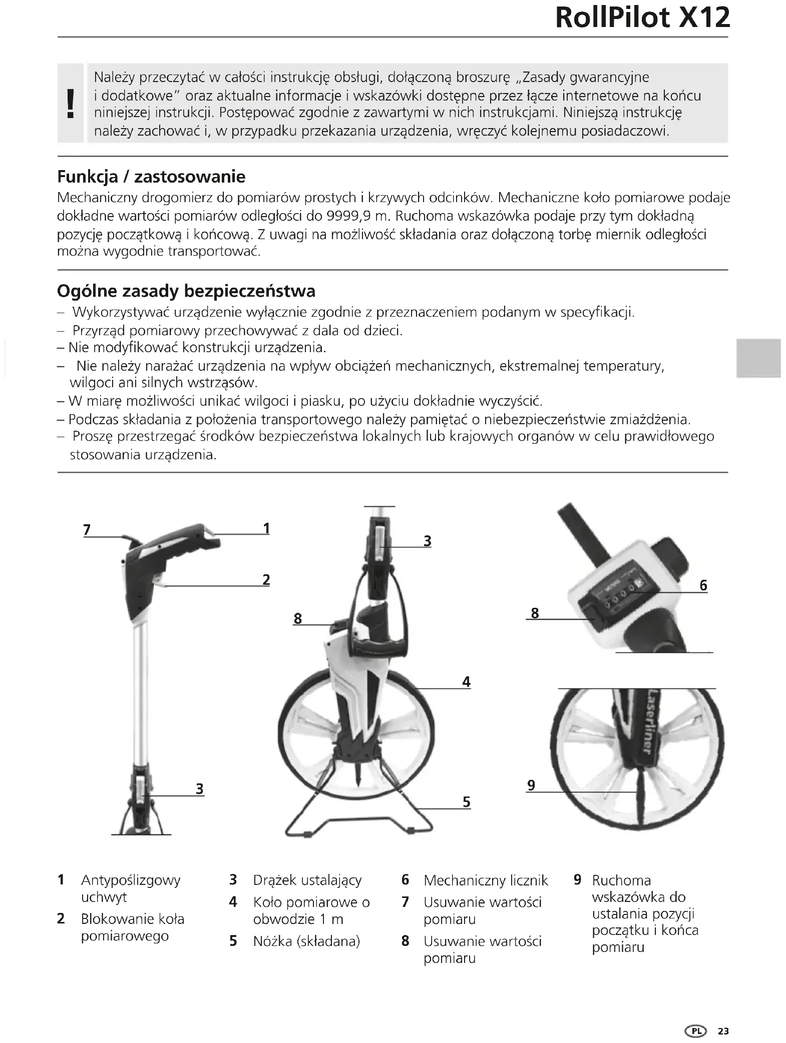 Funkcja / zastosowanie Mechaniczny drogomierz do pomiarów prostych i krzywych odcinków. Mechaniczne koło pomiarowe podaje dokładne wartości pomiarów odległości do 9999,9 m. Ruchoma wskazówka podaje przy tym dokładną pozycję początkową i końcową. Z uwagi na możliwość składania oraz dołączoną torbę miernik odległości można wygodnie transportować. Ogólne zasady bezpieczeństwa – Wykorzystywać urządzenie wyłącznie zgodnie z przeznaczeniem podanym w specykacji. – Przyrząd pomiarowy przechowywać z dala od dzieci. – Nie modykować konstrukcji urządzenia. – Nie należy narażać urządzenia na wpływ obciążeń mechanicznych, ekstremalnej temperatury, wilgoci ani silnych wstrząsów. – W miarę możliwości unikać wilgoci i piasku, po użyciu dokładnie wyczyścić. – Podczas składania z położenia transportowego należy pamiętać o niebezpieczeństwie zmiażdżenia. – Proszę przestrzegać środków bezpieczeństwa lokalnych lub krajowych organów w celu prawidłowego stosowania urządzenia.