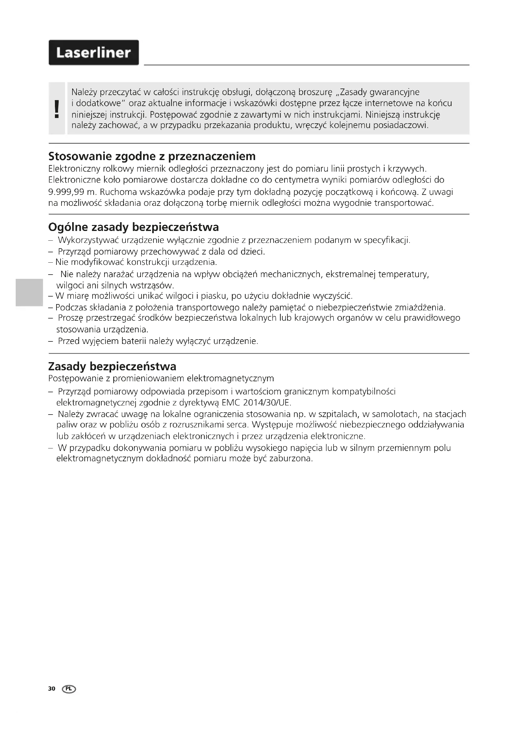 Dane Techniczne (Zmiany zastrzeżone. 23W13) Dokładność ± 0,1% Zasięg 0 – 9.999,99 m Promień koła pomiarowego 159 mm Obwód koła pomiarowego 1000 mm Funkcje Pomiar długości, Dodawanie i odejmowanie długości Jednostki ft, m Pamięć 5 miejsc w pamięci Automatyczne wyłączanie po 5 minutach (przy niezmienionym wskazaniu na wyświetlaczu) Zasilanie w prąd elektryczny 1 x 9V 6LR61 (Blok 9V) Temperatura robocza 0 … 40 °C Temperatura przechowywania -20 °C … 70 °C Wymiary (S x W x G) 318 x 1000 x 140 mm Masa (łącznie z baterią) 2100 g Przepisy UE iUK oraz utylizacja Urządzenie spełnia wszelkie normy wymagane do wolnego obrotu towarów wUE iUK. Ten produkt, wraz zakcesoriami iopakowaniem, jest urządzeniem elektrycznym, które należy poddać recyklingowi wsposób przyjazny dla środowiska, zgodnie zdyrektywami europejskimi ibrytyjskimi dotyczącymi zużytego sprzętu elektrycznego ielektronicznego, baterii iopakowań, wcelu odzyskania cennych surowców. Dalsze wskazówki dotyczące bezpieczeństwa i informacje dodatkowe patrz: https://www.laserliner.com Składanie w celu transportu Wskazówki dotyczące konserwacji i pielęgnacji Oczyścić wszystkie komponenty lekko zwilżoną ściereczką; unikać stosowania środków czyszczących, środków do szorowania i rozpuszczalników. Przed dłuższym składowaniem wyjąć baterie. Przechowywać urządzenie w czystym, suchym miejscu. Kalibracja Przyrząd pomiarowy napięcia musi być regularnie kalibrowany itestowany wcelu zapewnienia dokładności wyników pomiarów. Zalecamy przeprowadzać kalibrację raz na rok. Wtym celu należy skontaktować się ze sprzedawcą lub działem serwisu UMAREX-LASERLINER.34
