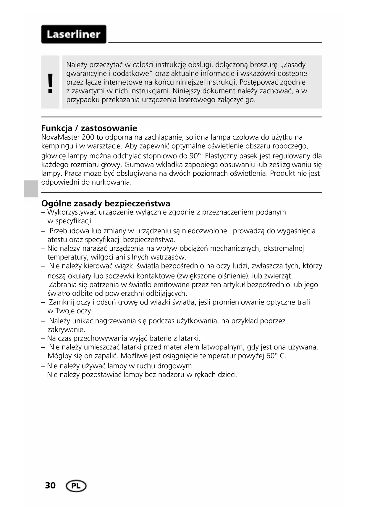 Norme UE e smaltimento L‘apparecchio soddisfa tutte le norme necessarie per la libera circolazione di merci all‘interno dell‘UE. Questo prodotto è un apparecchio elettrico e deve pertanto essere raccolto e smaltito separatamente in conformità con la direttiva europea sulle apparecchiature elettriche ed elettroniche usate. Per ulteriori informazioni ed indicazioni di sicurezza: www.laserliner.com/info Indicazioni per la manutenzione e la cura Pulire tutti i componenti con un panno leggermente inumidito ed evitare l‘impiego di prodotti detergenti, abrasivi e solventi. Rimuovere la batteria/le batterie prima di un immagazzinamento prolungato. Immagazzinare l‘apparecchio in un luogo pulito e asciutto. Dati tecnici (Con riserva di modiche tecniche. 21W04) Luminosità Alta / Bassa 200 / 100 lm Durata della luce Alta / Bassa 6 / 12 h LED-Chip Osram SMT3528 Classe di protezione IP 54 Alimentazione elettrica AAA Ni-MH 1,2 V / AAA alcaline 1,5 V Condizioni di lavoro -22° … 65° Condizioni di stoccaggio -30° … 65° Lunghezza complessiva 37 mm Peso complessivo 100 g IT30 Ogólne zasady bezpieczeństwa – Wykorzystywać urządzenie wyłącznie zgodnie z przeznaczeniem podanym w specyfikacji. – Przebudowa lub zmiany w urządzeniu są niedozwolone i prowadzą do wygaśnięcia atestu oraz specyfikacji bezpieczeństwa. – Nie należy narażać urządzenia na wpływ obciążeń mechanicznych, ekstremalnej temperatury, wilgoci ani silnych wstrząsów. – Nie należy kierować wiązki światła bezpośrednio na oczy ludzi, zwłaszcza tych, którzy noszą okulary lub soczewki kontaktowe (zwiększone olśnienie), lub zwierząt. – Zabrania się patrzenia w światło emitowane przez ten artykuł bezpośrednio lub jego światło odbite od powierzchni odbijających. – Zamknij oczy i odsuń głowę od wiązki światła, jeśli promieniowanie optyczne tra w Twoje oczy. – Należy unikać nagrzewania się podczas użytkowania, na przykład poprzez zakrywanie. – Na czas przechowywania wyjąć baterie z latarki. – Nie należy umieszczać latarki przed materiałem łatwopalnym, gdy jest ona używana. Mógłby się on zapalić. Możliwe jest osiągnięcie temperatur powyżej 60° C. – Nie należy używać lampy w ruchu drogowym. – Nie należy pozostawiać lampy bez nadzoru w rękach dzieci. Funkcja / zastosowanie NovaMaster 200 to odporna na zachlapanie, solidna lampa czołowa do użytku na kempingu i w warsztacie. Aby zapewnić optymalne oświetlenie obszaru roboczego, głowicę lampy można odchylać stopniowo do 90°. Elastyczny pasek jest regulowany dla każdego rozmiaru głowy. Gumowa wkładka zapobiega obsuwaniu lub ześlizgiwaniu się lampy. Praca może być obsługiwana na dwóch poziomach oświetlenia. Produkt nie jest odpowiedni do nurkowania. Należy przeczytać wcałości instrukcję obsługi, dołączoną broszurę „Zasady gwarancyjne idodatkowe” oraz aktualne informacje iwskazówki dostępne przez łącze internetowe na końcu niniejszej instrukcji. Postępować zgodnie z zawartymi w nich instrukcjami. Niniejszy dokument należy zachować, a w przypadku przekazania urządzenia laserowego załączyć go.