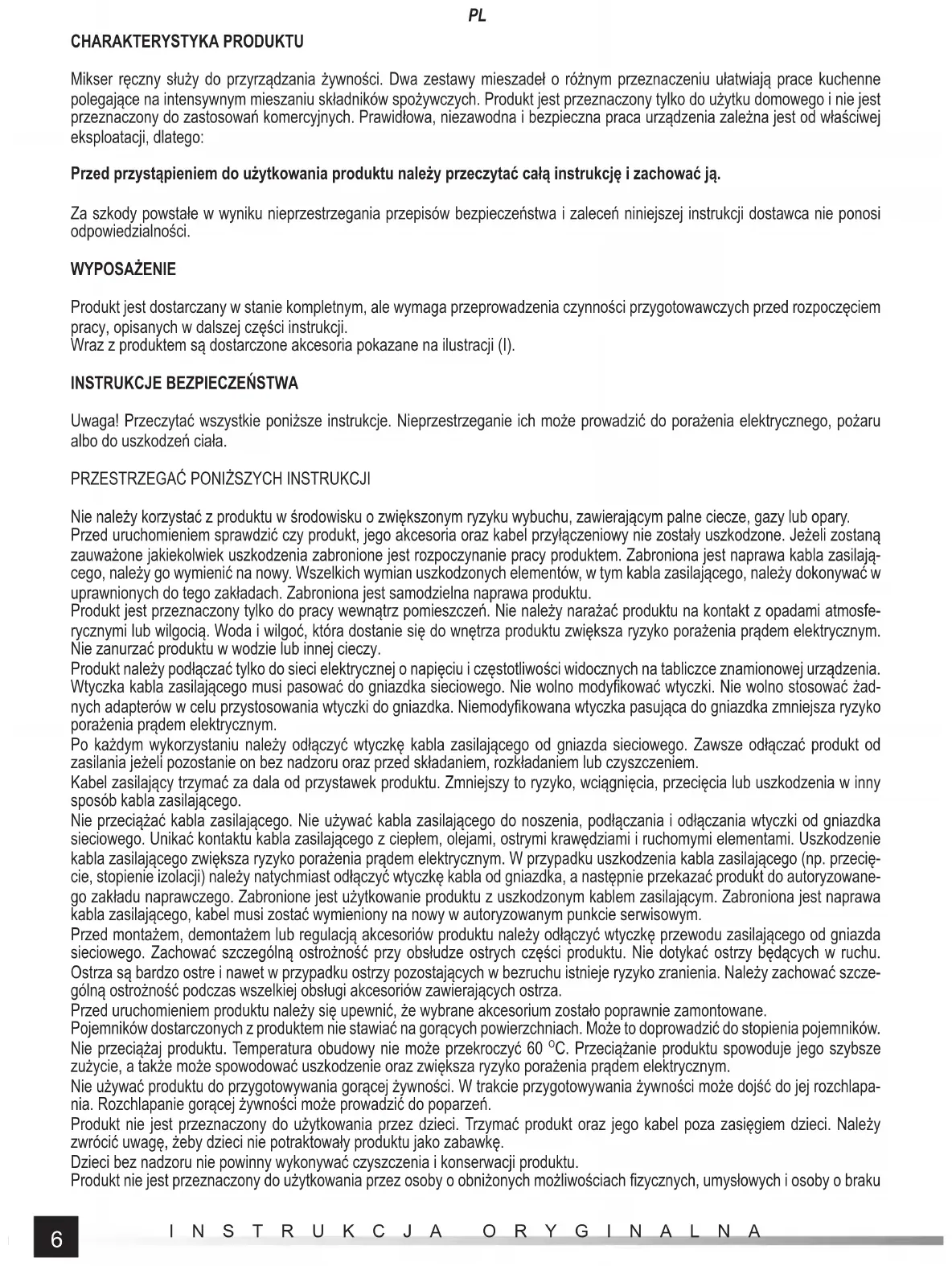 CHARAKTERYSTYKA PRODUKTU Mikser ręczny służy do przyrządzania żywności. Dwa zestawy mieszadeł o różnym przeznaczeniu ułatwiają prace kuchenne polegające na intensywnym mieszaniu składników spożywczych. Produkt jest przeznaczony tylko do użytku domowego i nie jest przeznaczony do zastosowań komercyjnych. Prawidłowa, niezawodna i bezpieczna praca urządzenia zależna jest od właściwej eksploatacji, dlatego: Przed przystąpieniem do użytkowania produktu należy przeczytać całą instrukcję i zachować ją. Za szkody powstałe w wyniku nieprzestrzegania przepisów bezpieczeństwa i zaleceń niniejszej instrukcji dostawca nie ponosi odpowiedzialności. WYPOSAŻENIE Produkt jest dostarczany w stanie kompletnym, ale wymaga przeprowadzenia czynności przygotowawczych przed rozpoczęciem pracy, opisanych w dalszej części instrukcji. Wraz z produktem są dostarczone akcesoria pokazane na ilustracji (I).