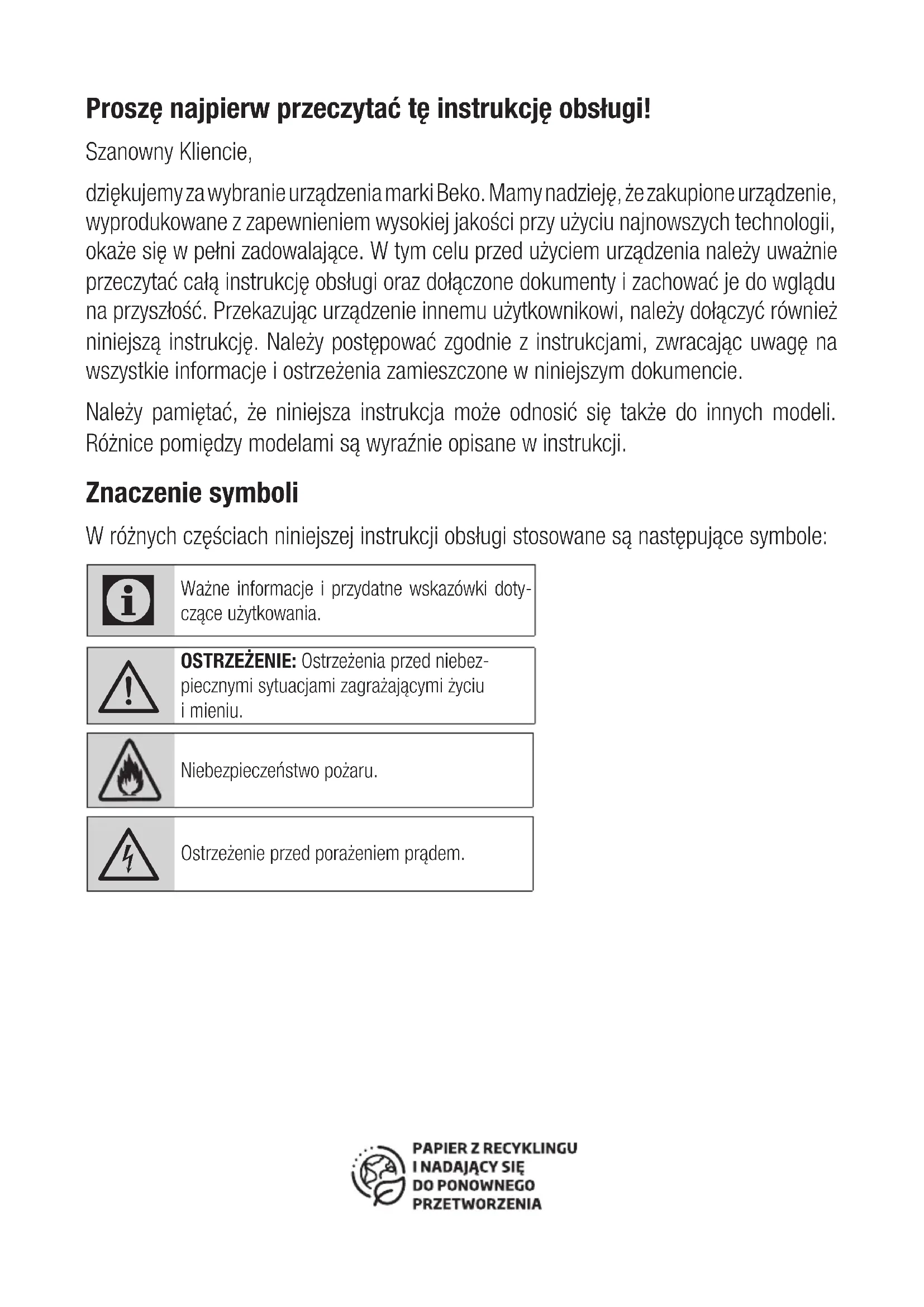 - Ne placez pas de charges lourdes sur l’appareil ou sur l’emballage. L’appareil peut être endommagé.Proszę najpierw przeczytać tę instrukcję obsługi! Szanowny Kliencie, dziękujemy za wybranie urządzenia marki Beko. Mamy nadzieję, że zakupione urządzenie, wyprodukowane z zapewnieniem wysokiej jakości przy użyciu najnowszych technologii, okaże się w pełni zadowalające. W tym celu przed użyciem urządzenia należy uważnie przeczytać całą instrukcję obsługi oraz dołączone dokumenty i zachować je do wglądu na przyszłość. Przekazując urządzenie innemu użytkownikowi, należy dołączyć również niniejszą instrukcję. Należy postępować zgodnie z instrukcjami, zwracając uwagę na wszystkie informacje i ostrzeżenia zamieszczone w niniejszym dokumencie. Należy pamiętać, że niniejsza instrukcja może odnosić się także do innych modeli. Różnice pomiędzy modelami są wyraźnie opisane w instrukcji. Znaczenie symboli W różnych częściach niniejszej instrukcji obsługi stosowane są następujące symbole: