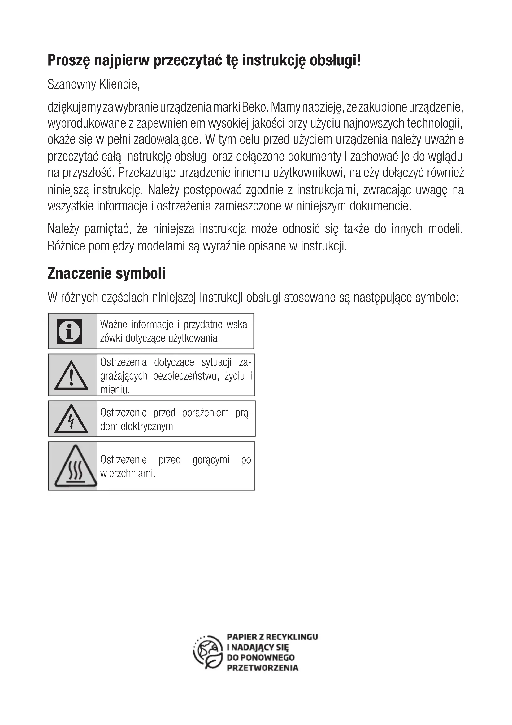 - záruka se nevztahuje na návštěvu technika za účelem poradenství, preventivní kontrolu stavu spotřebiče, výměnu náhradního dílu, který nevyžaduje odborný zásah, záměna směru otvírání dveří chladničekProszę najpierw przeczytać tę instrukcję obsługi! Szanowny Kliencie, dziękujemy za wybranie urządzenia marki Beko. Mamy nadzieję, że zakupione urządzenie, wyprodukowane z zapewnieniem wysokiej jakości przy użyciu najnowszych technologii, okaże się w pełni zadowalające. W tym celu przed użyciem urządzenia należy uważnie przeczytać całą instrukcję obsługi oraz dołączone dokumenty i zachować je do wglądu na przyszłość. Przekazując urządzenie innemu użytkownikowi, należy dołączyć również niniejszą instrukcję. Należy postępować zgodnie z instrukcjami, zwracając uwagę na wszystkie informacje i ostrzeżenia zamieszczone w niniejszym dokumencie. Należy pamiętać, że niniejsza instrukcja może odnosić się także do innych modeli. Różnice pomiędzy modelami są wyraźnie opisane w instrukcji. Znaczenie symboli W różnych częściach niniejszej instrukcji obsługi stosowane są następujące symbole:
