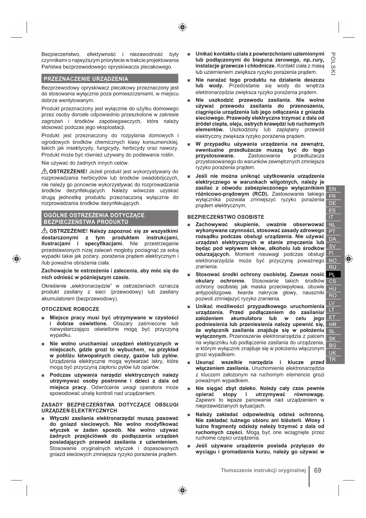 ● cieczy lepkich lub kleistych ● żrących lub korozyjnych substancji chemicznych ● cieczy o temperaturze wyższej niż 50°C. ■ Nie rozpylać produktu w miejscach, gdzie występują iskry, płomienie lub inne źródła zapłonu. ■ Nie wolno używać urządzenia z uszkodzonymi osłonami lub pokrywami lub bez elementów zabezpieczających. Nigdy nie używać niekompletnego lub zmodyfikowanego produktu. Użycie wadliwego, niekompletnego lub zmodyfikowanego produktu może doprowadzić do sytuacji zagrożenia. ■ Nie rozpylać produktu w kierunku ludzi ani zwierzęta. Należy unikać spryskiwania w wietrzne dni. Rozpylany materiał może być przypadkowo rozpylony na rośliny lub obiekty, które nie powinny być natryskiwane. Zawsze należy spryskiwać na dół. ■ W razie wypadku lub awarii natychmiast wyłączyć i wymontować akumulator. Nie należy włączać produktu ponownie, dopóki nie zostanie w pełni sprawdzony przez autoryzowane centrum serwisowe. ■ Jeśli z dyszy nie wydostaje się aerozol lub jego ilość jest zmniejszona, może to oznaczać, że układ węża i lancy są zablokowane. Wypłukać i oczyścić wszystkie części układu węża i lancy (pistolet natryskowy, filtr w zbiorniku, lancę i wąż) czystą wodą. Nigdy nie przedmuchiwać dysz lub innych komponentów ustami. ■ Unikać kontaktu ze środkami ochrony roślin. Odzież zanieczyszczoną środkami ochrony roślin należy natychmiast przebrać. Materiały do natryskiwania muszą znajdować się z dala od oczu. Jeśli natryskiwany materiał zetknie się z oczami, należy natychmiast przepłukać oczy czystą wodą. Jeśli podrażnienie nadal występuje, należy natychmiast zwrócić się o pomoc medyczną. ■ Rozpylane materiały mogą być niebezpieczne w przypadku wchłonięcia, połknięcia lub zetknięcia ze skórą lub oczami. Należy nosić odpowiednią odzież ochronną i sprzęt ochronny, w trakcie: ● napełniania zbiornika środkami opryskowymi; ● opryskiwania; ● wykonywania regulacji; ● opróżniania i czyszczenia zbiornika; ● wymiany środka opryskowego; ● serwisowania produktu. ■ Przed użyciem zawsze sprawdzać produkt pod kątem nieszczelności i usuwać je. ■ Przed każdym użyciem należy sprawdzić wewnętrzną i zewnętrzną stronę produktu oraz sprawdzić stan elementów. Należy sprawdzić, czy przewody nie są pęknięte lub uszkodzone, czy nie ma wycieków, czy dysze nie są zapchane oraz czy nie ma uszkodzonych lub brakujących części. Jeśli produkt jest uszkodzony, należy naprawić go przed użyciem. Wiele wypadków jest spowodowanych na skutek nieprawidłowej konserwacji produktów. ■ Należy zdawać sobie sprawę z wszelkich zagrożeń stwarzanych przez roztwory substancji chemicznych. Należy zawsze postępować zgodnie z instrukcjami producenta substancji chemicznych dotyczącymi użytkowania, obsługi i przechowywania. ■ Nie należy używać produktu z żadnymi substancjami, w przypadku których zagrożenie nie jest znane. ■ Przed użyciem produktu należy upewnić się, że lanca jest dobrze przymocowana do uchwytu lancy. W razie potrzeby należy użyć szczypiec w celu zamocowania lancy do uchwytu lancy. ■ Po wlaniu przeznaczonej do rozpylania cieczy do zbiornika należy prawidłowo założyć i dokręcić jego pokrywę. ■ Po długim przechowywaniu lub po zimie spryskać produkt czystą wodą. Sprawdzić, czy nie ma żadnych przecieków lub pęknięć. ■ Zawsze należy postępować zgodnie z instrukcjami producenta wydrukowanymi na etykiecie produktu w zakresie użytkowania, czyszczenia i przechowywania. Środki chemiczne należy przechowywać poza zasięgiem dzieci. ■ Aby zmniejszyć ryzyko pożaru lub wybuchu, nie należy używać produktu z płynami łatwopalnymi, takimi jak benzyna lub inne substancje chemiczne o temperaturze zapłonu poniżej 55°C. ■ Produkt należy stosować tylko w temperaturach od 0°C do 40°C. ■ Produkt należy przechowywać w miejscu, w którym temperatura otoczenia wynosi od 0°C do 40°C. ■ Długotrwałe użytkowanie narzędzia może spowodować obrażenia ciała lub nasilić dolegliwości zdrowotne. W przypadku długotrwałego użytkowania jakiegokolwiek produktu należy robić regularne przerwy. MIESZANIE ROZTWORU ■ Zmieszać chemikalia dokładnie tak, jak podano w instrukcji producenta. Nieprawidłowo przygotowana mieszanina może wydzielać toksyczne opary lub tworzyć roztwory wybuchowe. ■ Nigdy nie należy używać nierozcieńczonych, płynnych środków ochrony roślin. ■ Roztwór należy przygotowywać, a pojemnik napełniać wyłącznie na zewnątrz lub w dobrze wentylowanych pomieszczeniach. ■ Przygotowywać tylko taką ilość roztworu, jaka w danym momencie jest potrzebna. ■ Nigdy nie mieszać różnych chemikaliów, jeżeli taka mieszanina nie została zatwierdzona przez producenta.