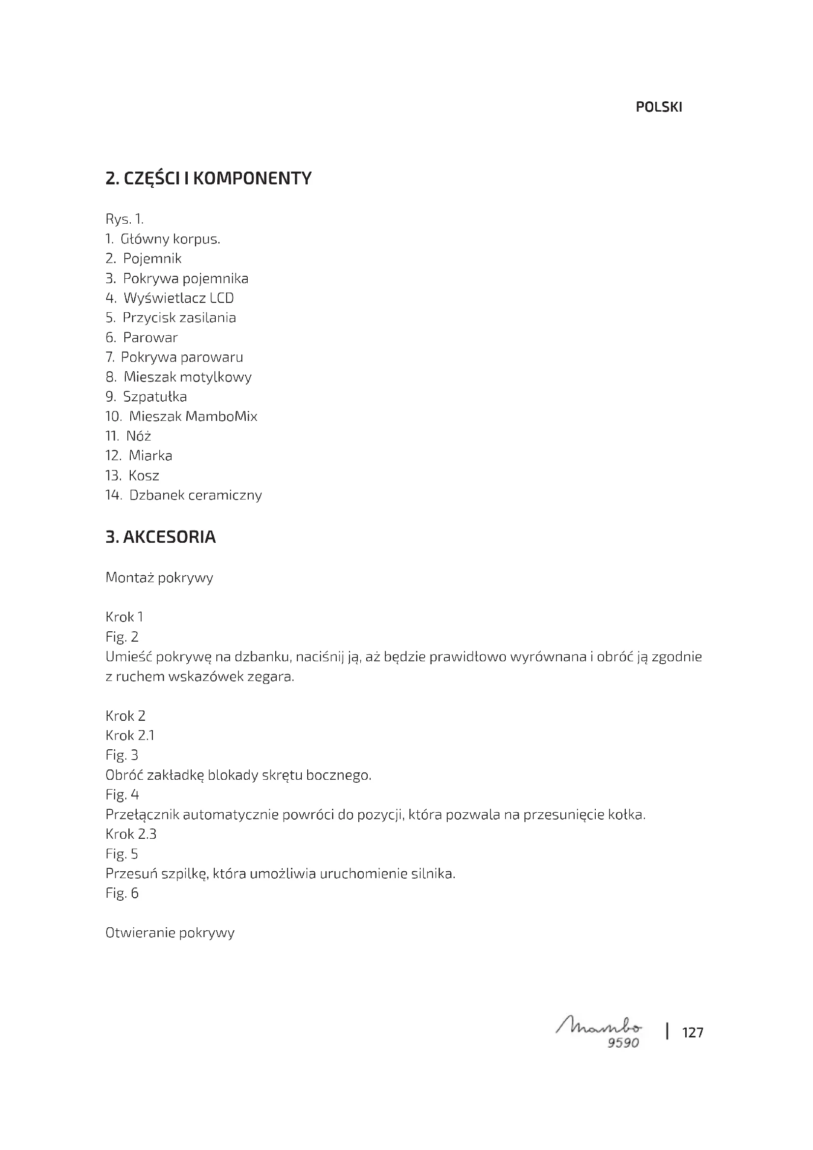 Montaż pokrywy Krok 1 Fig. 2 Umieść pokrywę na dzbanku, naciśnij ją, aż będzie prawidłowo wyrównana i obróć ją zgodnie z ruchem wskazówek zegara. Krok 2 Krok 2.1 Fig. 3 Obróć zakładkę blokady skrętu bocznego. Fig. 4 Przełącznik automatycznie powróci do pozycji, która pozwala na przesunięcie kołka. Krok 2.3 Fig. 5 Przesuń szpilkę, która umożliwia uruchomienie silnika. Fig. 6 Otwieranie pokrywy128 POLSKI Krok 1 Fig. 7 Naciśnij koło selektora, aby zatrzymać silnik. Krok 2 Krok 2.1 Fig. 8 Przesuń szpilkę, która umożliwia uruchomienie silnika. Krok 2.2 Fig. 9 Naciśnij przełącznik, aby odblokować ruch bocznej karty. Krok 2.3 Fig. 10 Podnieś kartę po stronie zwalniania otworu. Fig. 11 Krok 3 Fig. 12 Obróć pokrywę w kierunku przeciwnym do ruchu wskazówek zegara. Montaż pojemnika Wysokiej jakości dzbanek ze stali nierdzewnej służy do czyszczenia zmywarki i jest zgodny ze wszystkimi funkcjami gotowania. Ceramiczny dzbanek o wysokiej nieprzywieralności pozwala osiągnąć doskonałe wyniki w najdelikatniejszych opracowaniach, takich jak beszamel, kremy, rozpuszczona czekolada itp. Uwaga: naczynie cermaiczne nie jest kompatybilne z ostrzami. Można go używać wyłącznie z łyżką MamboMix. Umieść pokrywę na pojemniku, przyciśnij i przekręcaj w kierunku zgodnym z ruchem wskazówek zegara, dopóki nie będzie dobrze zamknięta. Urządzenie nie zadziała, jeśli pokrywa nie jest dobrze zamknięta. Rys. 13. Załóż pokrywę na naczynie, delikatnie ją dociśnij i przekręć w kierunku ruchu wskazówek zegara, aż będzie dobrze zamocowana. Jeśli naczynie nie jest prawidłowo zainstalowane, urządzenie nie zadziała. Uwaga: dzbanek ma ślady po jednej ze swoich stron. Jego maksymalna użyteczna pojemność wynosi 2 litry. Nie przekraczaj maksymalnego poziomu, aby urządzenie mogło prawidłowo działać. Rys. 14. Załóż naczynie na korpus główny urządzenia i upewnij się, czy znajduje się we właściwej129 POLSKI pozycji. Jeśli naczynie nie jest prawidłowo zainstalowane, urządzenie nie zadziała. Montaż noży Zamontować pierścień uszczelniający na zespole ostrza, włożyć go do słoika i umieścić w otworze podstawy. Przytrzymaj mocno górną część zespołu ostrzy i odwróć dzbanek. Upewnij się, czy wszytskie elementy znajdują się we właściwej pozycji. Zainstaluj wspornik mocujący na dnie słoika i obróć go w prawo, aby przymocować zespół ostrza do dzbanka. Aby wyciągnąć część nośną mieszaków z pojemnika, przekręć nakrętkę mocującą w kierunku przeciwnym do ruchu wskazówek zegara. Mocno przytrzymaj część nośną mieszaków przy wyciąganiu, aby uniknąć możliwej szkody spowodowanej jej upadkiem. Rys.15. Uwaga: Przy poruszaniu mieszaków używaj ściereczki lub innej ochrony, aby uniknąć skaleczenia. Umieść nakrętkę mocującą i uszczelkę w dopasowanej pozycji, aby uniknąć przedostawania się żywności na zewnątrz. Nóż MamboMix Ta część jest przeznaczona do mieszania składników bez ich krojenia. Aby zdemontować mieszak, przytrzymaj go mocno i przekręć pojemnik w kierunku przeciwnym do ruchu wskazówek zegara. Uwaga: Nie używaj tego akcesorium przy prędkościach większych niż 3; Słoik może się trząść i spowodować uszkodzenie. Rys. 16. Ostrzeżenie: odległość między wałkiem ugniatającym a ścianą słoika wynosi 1 cm, więc możliwe jest, że jedzenie utknęło. Jeśli to się wydarzy, silnik urządzenia automatycznie wyłączy się, aby zapobiec uszkodzeniu. Użyj szpatułki, aby rozmieszać zalegające i blokujące mieszak składniki. Kiedy to zrobisz, urządzenie wznowi pracę. Miarka Miarka jest używana jako pokrywka, która zapobiega utracie ciepła i wydostawaniu się na zewnątrz części jedzenia, a także słuzy do mierzenia ilości jedzenia. Jej maksymalna pojemność to 150 ml. Gdy używasz funkcji bez temperatury, umieść miarkę w otworze w pokrywie. Obróć go w prawo, aby go zamknąć, i w lewo, aby go otworzyć i wyjąć. Rys. 17.130 POLSKI Uwaga: Do przykrycia otworu pokrywy przeznaczony jest wyłącznie korek pokrywy kielicha, nie używaj do tego celu żadnej innej części. Jeśli chcesz szkorzystać z innej funkcji niż gotowanie (mieszanie, mielenie, krojenie…), obróć korek pokrywy kielicha zgodnie z ruchem wskazówek zegara, aż do jego zamknięcia. Jeśli chcesz gotować w danej temperaturze, umieść szklankę w otworze pokrywki, nie mocując jej przez obrócenie. W ten sposób, będzie się wydostawała para wodna w odpowiedni sposób. Szpatułka Rys.18. Załączona łopatka jest jedynym narzędziem odpowiednim do usuwania żywności z wnętrza pojemnika blendera, ponieważ inne narzędzia mogą zarysować i uszkodzić powierzchnię. Nie używaj szpatułki podczas, gdy urządzenie wykonuje operacje przy pomocy noży. Mieszak motylkowy Rys.19. To akcesorium działa zainstalowane w górnej części zestawu ostrzy, w ten sposób pomaga mieszać żywność nie rozdrabniając jej podczas gotowania. Pomaga mieszać jedzenie i rozdrobnić grudki. Zamontuj mieszadło na zespole ostrza, upewniając się, że środek wału pasuje do otworu mocowania noża, i dociśnij go. Uwaga: Nie włączaj urządzenia jeśli akcesoria nie zostały dobrze zamontowane. Nie używaj go na prędkości powyżej 4. Nie używaj mieszadła jednocześnie z łopatką. Nie dodawaj składników w trakcie pracy urządzenia, gdyż może się uszkodzić lub zablokować. Kosz Rys.20. Kosz służy do wykonywania następujących funkcji: Odcedzania, przecierów, sosów itp. Po rozdrobnieniu, gotowania lub przygotowywania sosów, umieść koszyk w środku kielicha i dolej przygotowaną mase. Gulaszowe nijakie jedzenie czy makaron. Dodatki do gotowania, takie jak ryż lub ziemniaki. Parownik Kosz do gotowania na parze zawiera 3 części: Mniejszy koszyk do gotowania na parze, większy i pokrywkę.131 POLSKI Przed użyciem parowaru załóż pokrywę. Umieść kosz do gotowan