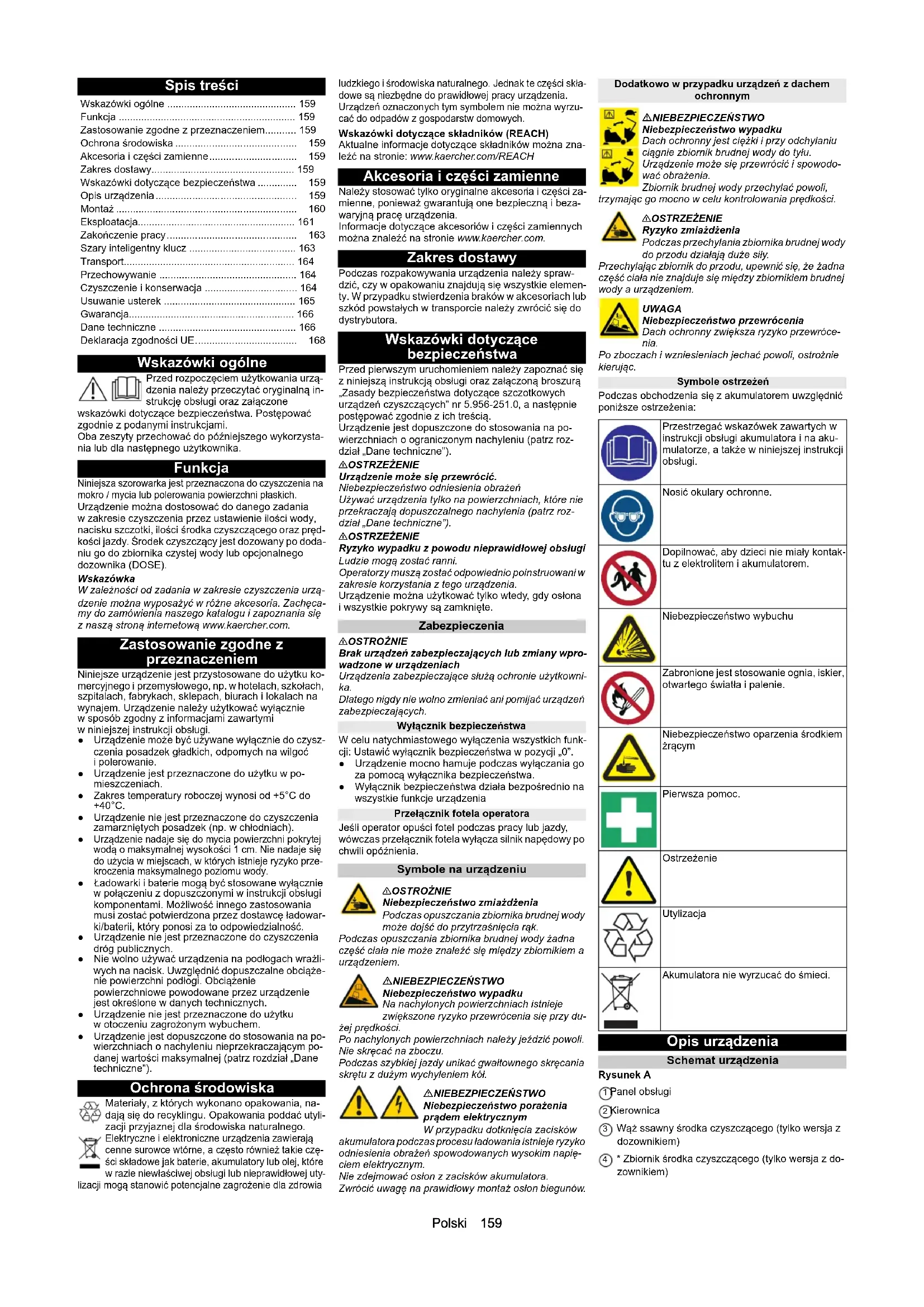- Urządzenie nadaje się do mycia powierzchni pokrytej wodą o maksymalnej wysokości 1 cm. Nie nadaje się do użycia w miejscach, w których istnieje ryzyko prze- kroczenia maksymalnego poziomu wody. ●Ładowarki i baterie mogą być stosowane wyłącznie w połączeniu z dopuszczonymi w instrukcji obsługi komponentami. Możliwość innego zastosowania musi zostać potwierdzona przez dostawcę ładowar- ki/baterii, który ponosi za to odpowiedzialność. ● Urządzenie nie jest przeznaczone do czyszczenia dróg publicznych. ● Nie wolno używać urządzenia na podłogach wrażli- wych na nacisk. Uwzględnić dopuszczalne obciąże- nie powierzchni podłogi. Obciążenie powierzchniowe powodowane przez urządzenie jest określone w danych technicznych. ● Urządzenie nie jest przeznaczone do użytku w otoczeniu zagrożonym wybuchem. ● Urządzenie jest dopuszczone do stosowania na po- wierzchniach o nachyleniu nieprzekraczającym po- danej wartości maksymalnej (patrz rozdział „Dane techniczne”). Ochrona środowiska Materiały, z których wykonano opakowania, na- dają się do recyklingu. Opakowania poddać utyli- zacji przyjaznej dla środowiska naturalnego. Elektryczne i elektroniczne urządzenia zawierają cenne surowce wtórne, a często również takie czę- ści składowe jak baterie, akumulatory lub olej, które w razie niewłaściwej obsługi lub nieprawidłowej uty- lizacji mogą stanowić potencjalne zagrożenie dla zdrowia ludzkiego i środowiska naturalnego. Jednak te części skła- dowe są niezbędne do prawidłowej pracy urządzenia. Urządzeń oznaczonych tym symbolem nie można wyrzu- cać do odpadów z gospodarstw domowych. Wskazówki dotyczące składników (REACH) Aktualne informacje dotyczące składników można zna- leźć na stronie: www.kaercher.com/REACH Akcesoria i części zamienne Należy stosować tylko oryginalne akcesoria i części za- mienne, ponieważ gwarantują one bezpieczną i beza- waryjną pracę urządzenia. Informacje dotyczące akcesoriów i części zamiennych można znaleźć na stronie www.kaercher.com. Zakres dostawy Podczas rozpakowywania urządzenia należy spraw- dzić, czy w opakowaniu znajdują się wszystkie elemen- ty. W przypadku stwierdzenia braków w akcesoriach lub szkód powstałych w transporcie należy zwrócić się do dystrybutora. Wskazówki dotyczące bezpieczeństwa Przed pierwszym uruchomieniem należy zapoznać się z niniejszą instrukcją obsługi oraz załączoną broszurą „Zasady bezpieczeństwa dotyczące szczotkowych urządzeń czyszczących” nr 5.956-251.0, a następnie postępować zgodnie z ich treścią. Urządzenie jest dopuszczone do stosowania na po- wierzchniach o ograniczonym nachyleniu (patrz roz- dział „Dane techniczne”). 몇 OSTRZEŻENIE Urządzenie może się przewrócić. Niebezpieczeństwo odniesienia obrażeń Używać urządzenia tylko na powierzchniach, które nie przekraczają dopuszczalnego nachylenia (patrz roz- dział „Dane techniczne”). 몇 OSTRZEŻENIE Ryzyko wypadku z powodu nieprawidłowej obsługi Ludzie mogą zostać ranni. Operatorzy muszą zostać odpowiednio poinstruowani w zakresie korzystania z tego urządzenia. Urządzenie można użytkować tylko wtedy, gdy osłona i wszystkie pokrywy są zamknięte. Zabezpieczenia 몇 OSTROŻNIE Brak urządzeń zabezpieczających lub zmiany wpro- wadzone w urządzeniach Urządzenia zabezpieczające służą ochronie użytkowni- ka. Dlatego nigdy nie wolno zmieniać ani pomijać urządzeń zabezpieczających. Wyłącznik bezpieczeństwa W celu natychmiastowego wyłączenia wszystkich funk- cji: Ustawić wyłącznik bezpieczeństwa w pozycji „0”. ● Urządzenie mocno hamuje podczas wyłączania go za pomocą wyłącznika bezpieczeństwa. ● Wyłącznik bezpieczeństwa działa bezpośrednio na wszystkie funkcje urządzenia Przełącznik fotela operatora Jeśli operator opuści fotel podczas pracy lub jazdy, wówczas przełącznik fotela wyłącza silnik napędowy po chwili opóźnienia. Symbole na urządzeniu 몇OSTROŻNIE Niebezpieczeństwo zmiażdżenia Podczas opuszczania zbiornika brudnej wody może dojść do przytrzaśnięcia rąk. Podczas opuszczania zbiornika brudnej wody żadna część ciała nie może znaleźć się między zbiornikiem a urządzeniem. NIEBEZPIECZEŃSTWO Niebezpieczeństwo wypadku Na nachylonych powierzchniach istnieje zwiększone ryzyko przewrócenia się przy du- żej prędkości. Po nachylonych powierzchniach należy jeździć powoli. Nie skręcać na zboczu. Podczas szybkiej jazdy unikać gwałtownego skręcania skrętu z dużym wychyleniem kół. NIEBEZPIECZEŃSTWO Niebezpieczeństwo porażenia prądem elektrycznym W przypadku dotknięcia zacisków akumulatora podczas procesu ładowania istnieje ryzyko odniesienia obrażeń spowodowanych wysokim napię- ciem elektrycznym. Nie zdejmować osłon z zacisków akumulatora. Zwrócić uwagę na prawidłowy montaż osłon biegunów. Dodatkowo w przypadku urządzeń z dachem ochronnym NIEBEZPIECZEŃSTWO Niebezpieczeństwo wypadku Dach ochronny jest ciężki i przy odchylaniu ciągnie zbiornik brudnej wody do tyłu. Urządzenie może się przewrócić i spowodo- wać obrażenia. Zbiornik brudnej wody przechylać powoli, trzymając go mocno w celu kontrolowania prędkości. 몇OSTRZEŻENIE Ryzyko zmiażdżenia Podczas przechylania zbiornika brudnej wody do przodu działają duże siły. Przechylając zbiornik do przodu, upewnić się, że żadna część ciała nie znajduje się między zbiornikiem brudnej wody a urządzeniem. UWAGA Niebezpieczeństwo przewrócenia Dach ochronny zwiększa ryzyko przewróce- nia. Po zboczach i wzniesieniach jechać powoli, ostrożnie kierując. Symbole ostrzeżeń Podczas obchodzenia się z akumulatorem uwzględnić poniższe ostrzeżenia: Opis urządzenia Schemat urządzenia Rysunek A 1 Panel obsługi 2 Kierownica 3 Wąż ssawny środka czyszczącego (tylko wersja z dozownikiem) 4 * Zbiornik środka czyszczące