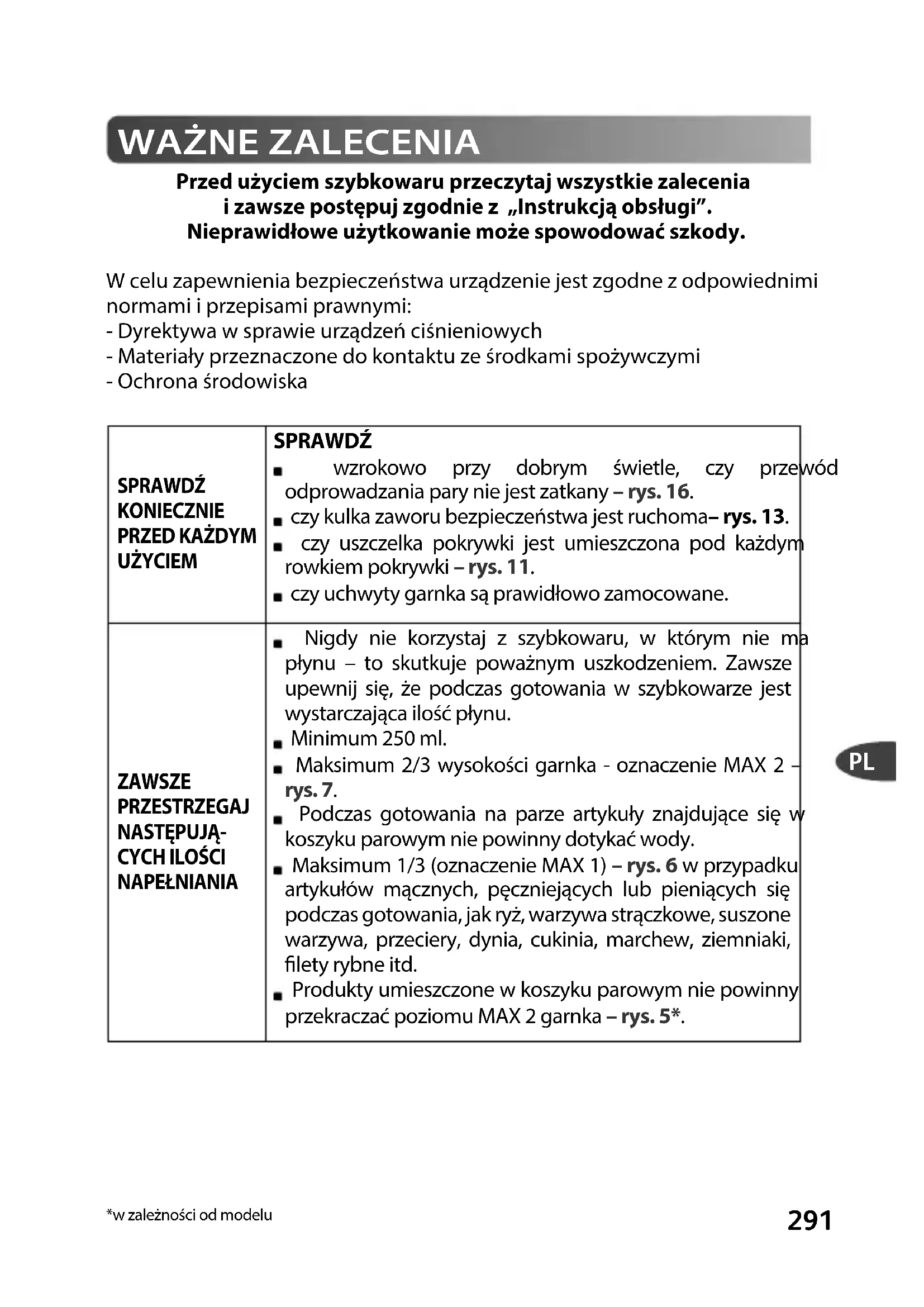 Przed użyciem szybkowaru przeczytaj wszystkie zalecenia i zawsze postępuj zgodnie z „Instrukcją obsługi”. Nieprawidłowe użytkowanie może spowodować szkody. W celu zapewnienia bezpieczeństwa urządzenie jest zgodne z odpowiednimi normami i przepisami prawnymi: - Dyrektywa w sprawie urządzeń ciśnieniowych - Materiały przeznaczone do kontaktu ze środkami spożywczymi - Ochrona środowiska SPRAWDŹ KONIECZNIE