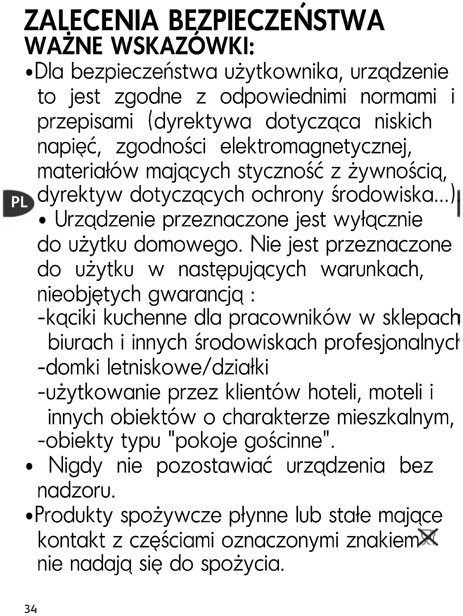 - Urządzenie przeznaczone jest wyłącznie do użytku domowego. Nie jest przeznaczone do użytku w następujących warunkach, nieobjętych gwarancją : -kąciki kuchenne dla pracowników w sklepach, biurach i innych środowiskach profesjonalnych, -domki letniskowe/działki -użytkowanie przez klientów hoteli, moteli i innych obiektów o charakterze mieszkalnym, -obiekty typu "pokoje gościnne".