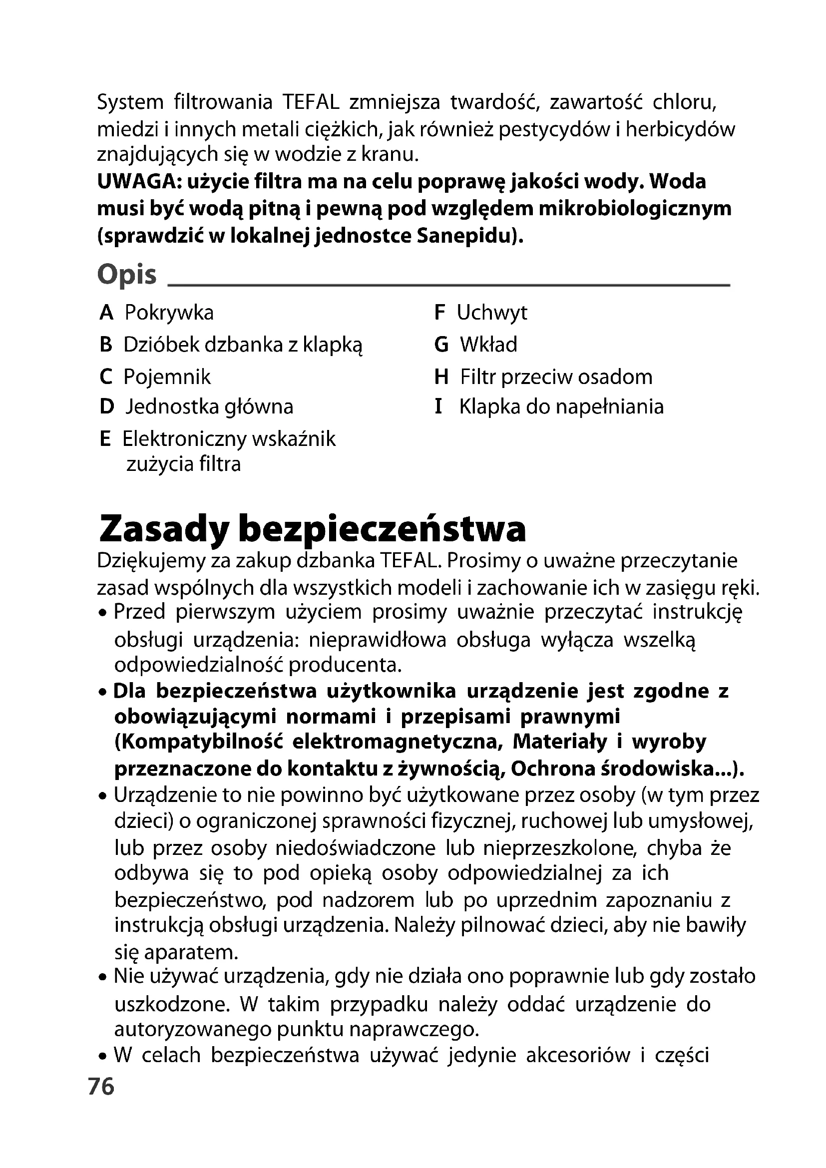 - Ostatné diely likvidujte podľa ich odpadovej triedy (plasty, pevný odpad z domácností v prípade náplne). TE_CARAFE_NC00111257_Mise en page 1 04/06/12 09:08 Page75System filtrowania TEFAL zmniejsza twardość, zawartość chloru, miedzi i innych metali ciężkich, jak również pestycydów i herbicydów znajdujących się w wodzie z kranu. UWAGA: użycie filtra ma na celu poprawę jakości wody. Woda musi być wodą pitną i pewną pod względem mikrobiologicznym (sprawdzić w lokalnej jednostce Sanepidu). Opis Zasady bezpieczeństwa Dziękujemy za zakup dzbanka TEFAL. Prosimy o uważne przeczytanie zasad wspólnych dla wszystkich modeli i zachowanie ich w zasięgu ręki.