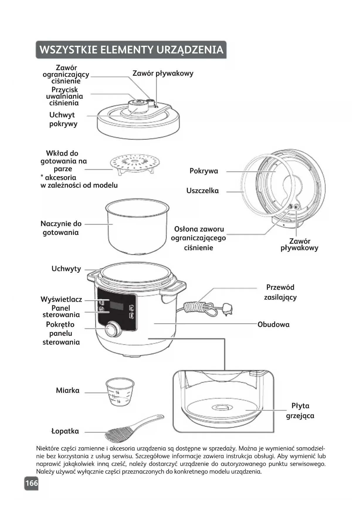 OK166 Panel sterowania Naczynie do gotowania Wkład do gotowania na parze Uchwyty Wyświetlacz Pokrętło panelu sterowania Miarka Łopatka Płyta grzejąca Przewód zasilający Obudowa Uchwyt pokrywy Przycisk uwalniania ciśnienia Zawór ograniczający ciśnienie Zawór pływakowy Zawór pływakowy Uszczelka Osłona zaworu ograniczającego ciśnienie Pokrywa *akcesoria w zależności od modelu