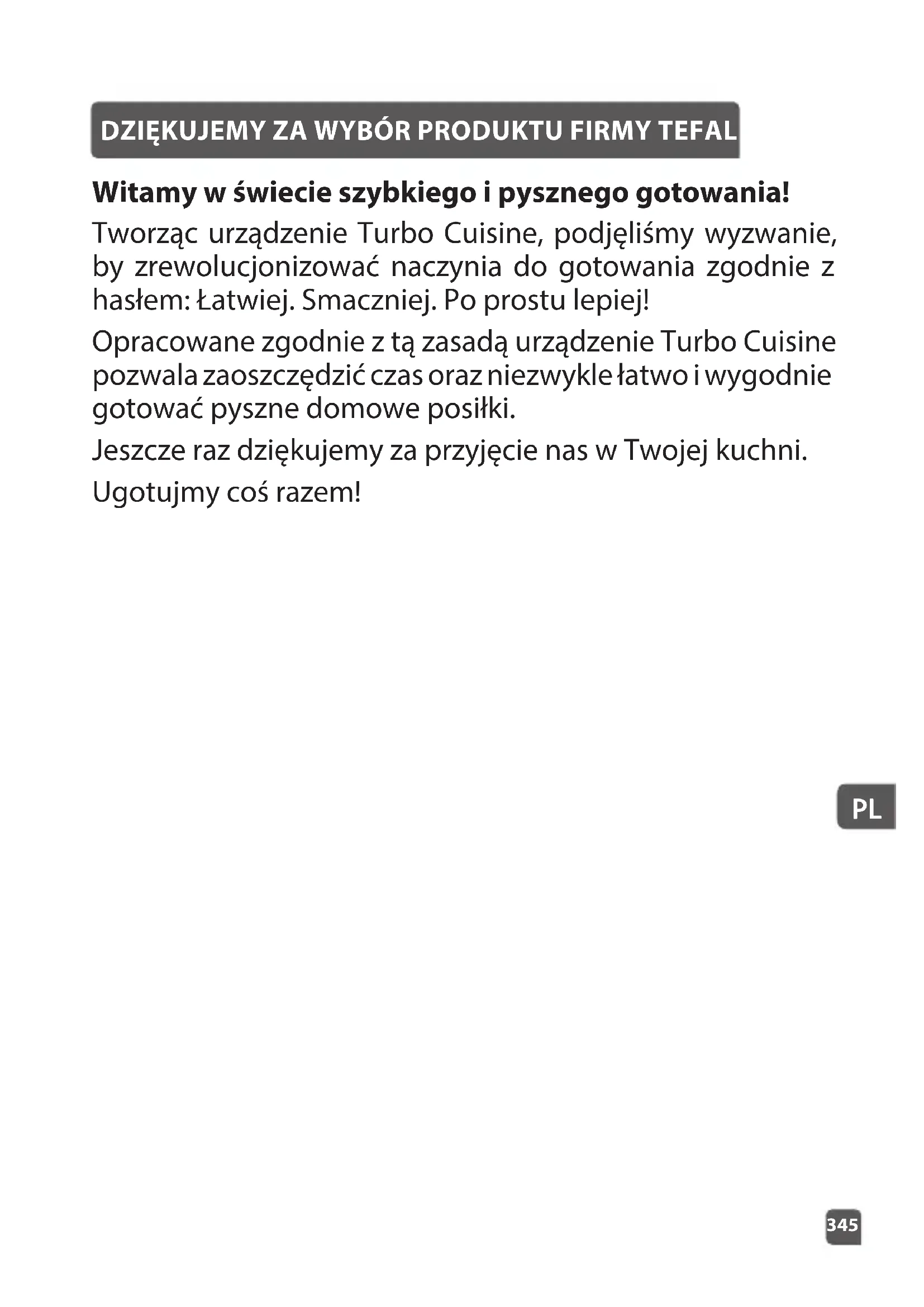 DZIĘKUJEMY ZA WYBÓR PRODUKTU FIRMY TEFAL Witamy w świecie szybkiego i pysznego gotowania! Tworząc urządzenie Turbo Cuisine, podjęliśmy wyzwanie, by zrewolucjonizować naczynia do gotowania zgodnie z hasłem: Łatwiej. Smaczniej. Po prostu lepiej! Opracowane zgodnie z tą zasadą urządzenie Turbo Cuisine pozwala zaoszczędzić czas oraz niezwykle łatwo i wygodnie gotować pyszne domowe posiłki. Jeszcze raz dziękujemy za przyjęcie nas w Twojej kuchni. Ugotujmy coś razem!347346