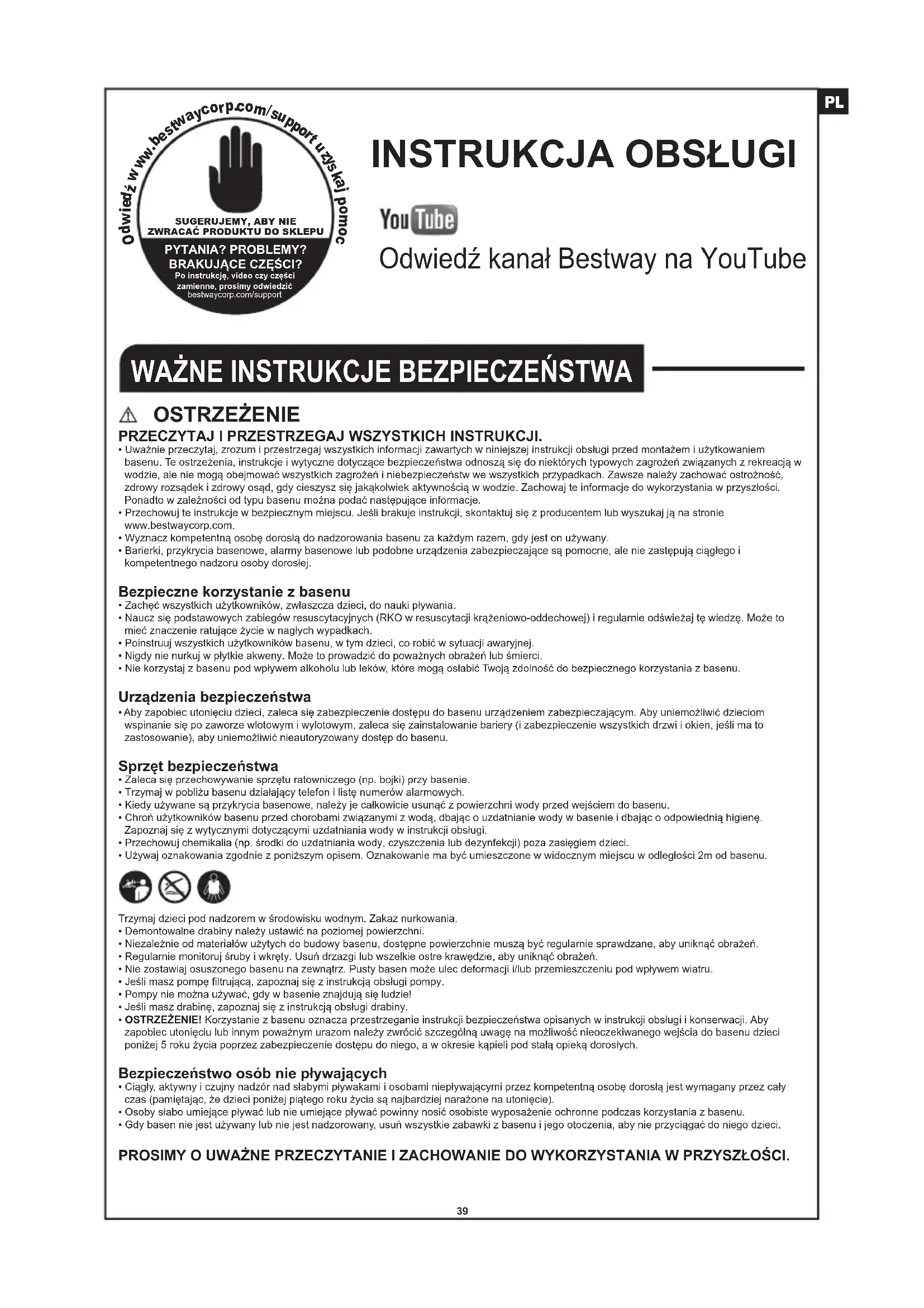 Odwiedź kanał Bestway na YouTube OSTRZEŻENIE PRZECZYTAJ I PRZESTRZEGAJ WSZYSTKICH INSTRUKCJI.