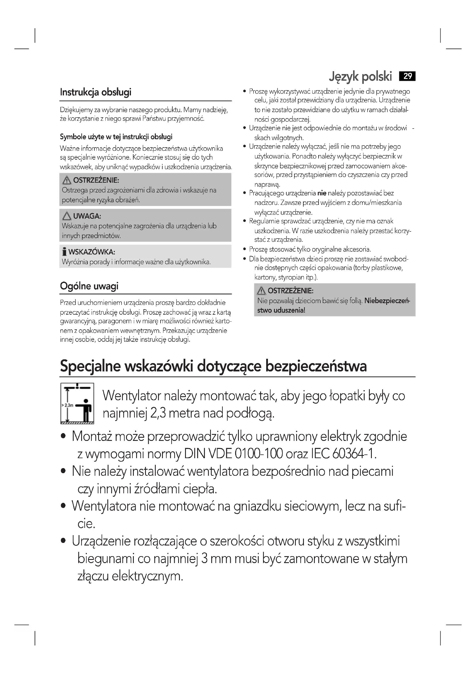 Instrukcja obsługi Dziękujemy za wybranie naszego produktu. Mamy nadzieję, że korzystanie z niego sprawi Państwu przyjemność.Symbole użyte w tej instrukcji obsługiWażne informacje dotyczące bezpieczeństwa użytkownika są specjalnie wyróżnione. Koniecznie stosuj się do tych wskazówek, aby uniknąć wypadków i uszkodzenia urządzenia. OSTRZEŻENIE: Ostrzega przed zagrożeniami dla zdrowia i wskazuje na potencjalne ryzyka obrażeń. UWAGA: Wskazuje na potencjalne zagrożenia dla urządzenia lub innych przedmiotów. WSKAZÓWKA: Wyróżnia porady i informacje ważne dla użytkownika. Ogólne uwagi Przed uruchomieniem urządzenia proszę bardzo dokładnie przeczytać instrukcję obsługi. Proszę zachować ją wraz z kartą gwarancyjną, paragonem i w miarę możliwości również karto-nem z opakowaniem wewnętrznym. Przekazując urządzenie innej osobie, oddaj jej także instrukcję obsługi.• Proszę wykorzystywać urządzenie jedynie dla prywatnego celu, jaki został przewidziany dla urządzenia. Urządzenie to nie zostało przewidziane do użytku w ramach działal ności gospodarczej. • Urządzenie nie jest odpowiednie do montażu w środowi skach wilgotnych.• Urządzenie należy wyłączać, jeśli nie ma potrzeby jego użytkowania. Ponadto należy wyłączyć bezpiecznik w skrzynce bezpiecznikowej przed zamocowaniem akce-soriów, przed przystąpieniem do czyszczenia czy przed naprawą.• Pracującego urządzenia nie należy pozostawiać bez nadzoru. Zawsze przed wyjściem z domu/mieszkania wyłączać urządzenie.• Regularnie sprawdzać urządzenie, czy nie ma oznak uszkodzenia. W razie uszkodzenia należy przestać korzy-stać z urządzenia.• Proszę stosować tylko oryginalne akcesoria.• Dla bezpieczeństwa dzieci proszę nie zostawiać swobod-nie dostępnych części opakowania (torby plastikowe, kartony, styropian itp.). OSTRZEŻENIE: Nie pozwalaj dzieciom bawić się folią. Niebezpieczeń stwo uduszenia! Specjalne wskazówki dotyczące bezpieczeństwa Wentylator należy montować tak, aby jego łopatki były co najmniej 2,3 metra nad podłogą.