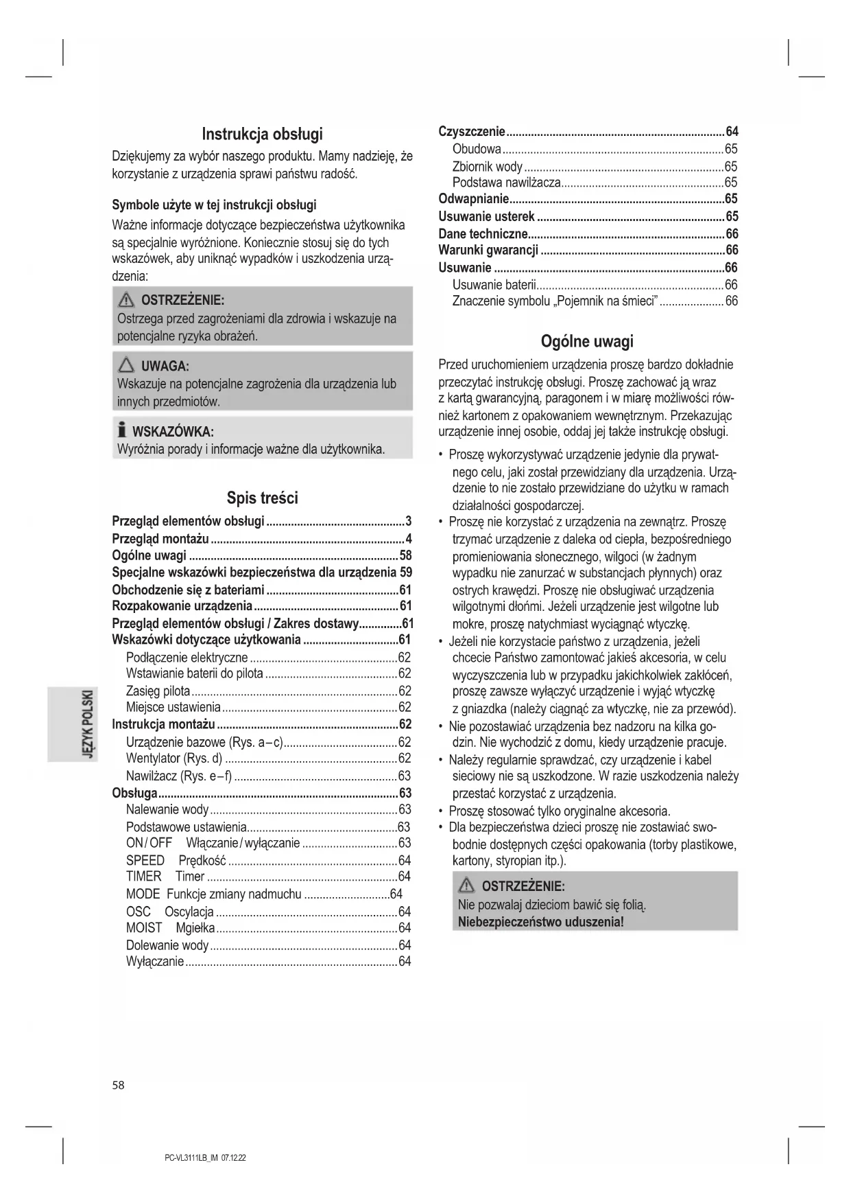 - Co 3 dni zbiornik wody należy opróżnić i ponownie napełnić. Zbiornik należy umyć czystą wodą. Należy usunąć wszelkie osady i warstwy brudu, jakie narosły na zewnętrznych lubPC-VL3111LB_IM 07.12.22