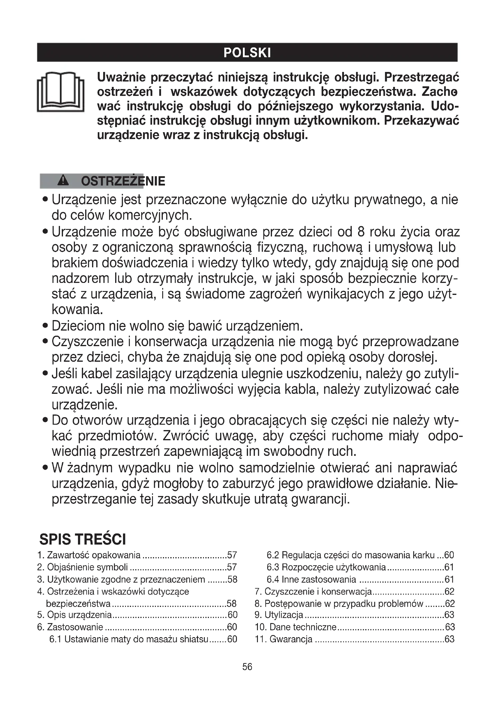 Urządzenie przeznaczone jest wyłącznie do masażu pleców ikarku uludzi. Nie może zastępować lecze- nia zaleconego przez lekarza. Zaparatu do masażu nie wolno korzystać wżadnym zniżej wymienionych przypadków. OSTRZEŻENIE Nie należy używać aparatu do masażu