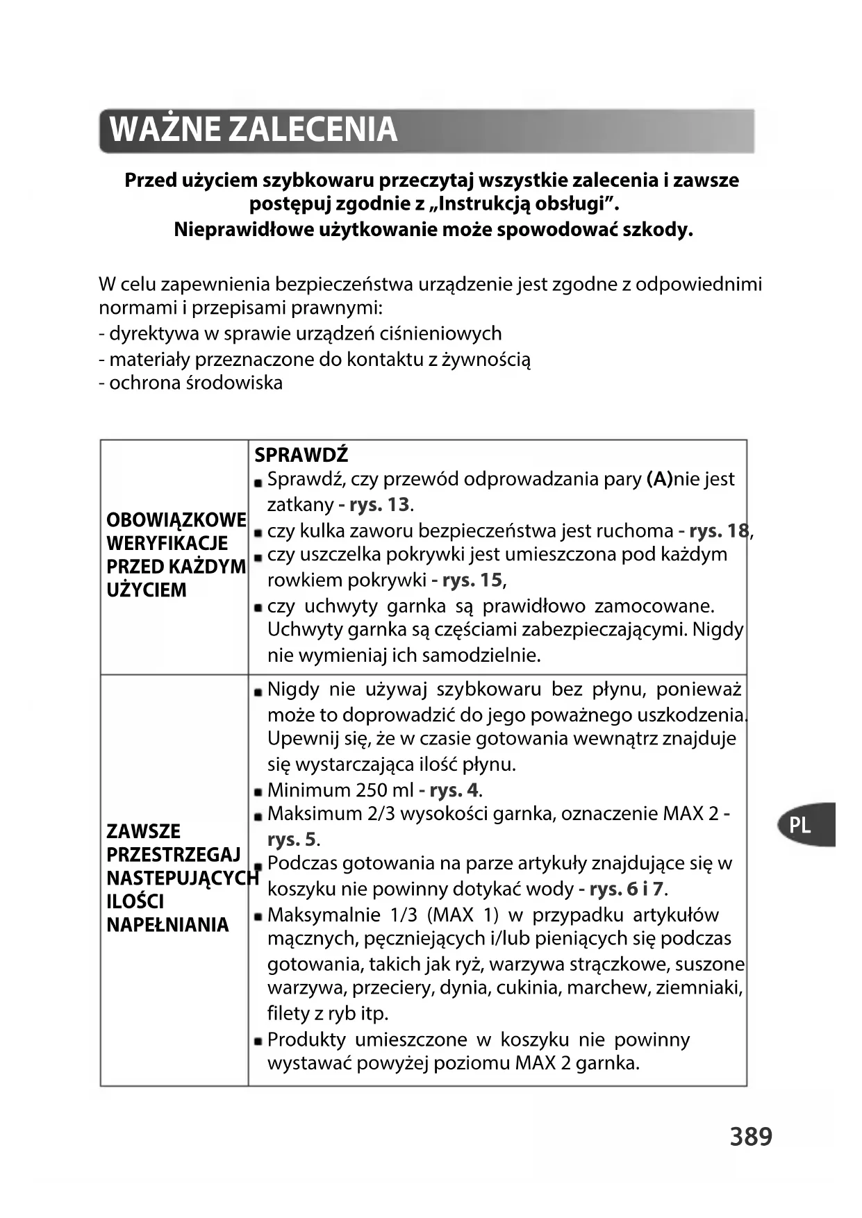 Przed użyciem szybkowaru przeczytaj wszystkie zalecenia i zawsze postępuj zgodnie z „Instrukcją obsługi”. Nieprawidłowe użytkowanie może spowodować szkody. W celu zapewnienia bezpieczeństwa urządzenie jest zgodne z odpowiednimi normami i przepisami prawnymi: - dyrektywa w sprawie urządzeń ciśnieniowych - materiały przeznaczone do kontaktu z żywnością - ochrona środowiska