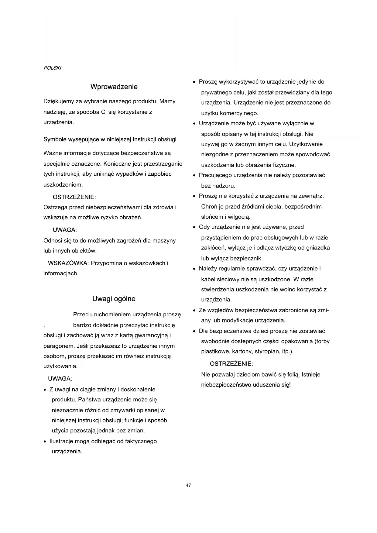 Przed uruchomieniem urządzenia proszę bardzo dokładnie przeczytać instrukcję obsługi i zachować ją wraz z kartą gwarancyjną i paragonem. Jeśli przekażesz to urządzenie innym osobom, proszę przekazać im również instrukcję użytkowania. UWAGA: Z uwagi na ciągłe zmiany i doskonalenie produktu, Państwa urządzenie może się nieznacznie różnić od zmywarki opisanej w niniejszej instrukcji obsługi; funkcje i sposób użycia pozostają jednak bez zmian. Ilustracje mogą odbiegać od faktycznego urządzenia. Proszę wykorzystywać to urządzenie jedynie do prywatnego celu, jaki został przewidziany dla tego urządzenia. Urządzenie nie jest przeznaczone do użytku komercyjnego. Urządzenie może być używane wyłącznie w sposób opisany w tej instrukcji obsługi. Nie używaj go w żadnym innym celu. Użytkowanie niezgodne z przeznaczeniem może spowodować uszkodzenia lub obrażenia fizyczne. Pracującego urządzenia nie należy pozostawiać bez nadzoru. Proszę nie korzystać z urządzenia na zewnątrz. Chroń je przed źródłami ciepła, bezpośrednim słońcem i wilgocią. Gdy urządzenie nie jest używane, przed przystąpieniem do prac obsługowych lub w razie zakłóceń, wyłącz je i odłącz wtyczkę od gniazdka lub wyłącz bezpiecznik. Należy regularnie sprawdzać, czy urządzenie i kabel sieciowy nie są uszkodzone. W razie stwierdzenia uszkodzenia nie wolno korzystać z urządzenia. Ze względów bezpieczeństwa zabronione są zmi- any lub modyfikacje urządzenia. Dla bezpieczeństwa dzieci proszę nie zostawiać swobodnie dostępnych części opakowania (torby plastikowe, kartony, styropian, itp.). OSTRZEŻENIE: Nie pozwalaj dzieciom bawić się folią. Istnieje niebezpieczeństwo uduszenia się!48