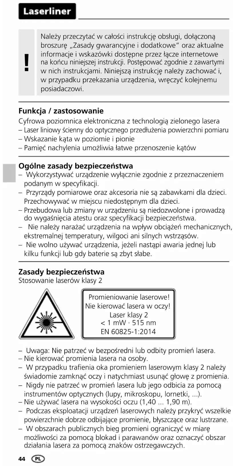 Przebudowa lub zmiany w urządzeniu są niedozwolone i prowadzą do wygaśnięcia atestu oraz specykacji bezpieczeństwa. – Nie należy narażać urządzenia na wpływ obciążeń mechanicznych, ekstremalnej temperatury, wilgoci ani silnych wstrząsów. – Nie wolno używać urządzenia, jeżeli nastąpi awaria jednej lub kilku funkcji lub gdy baterie są zbyt słabe. Zasady bezpieczeństwa Stosowanie laserów klasy 2 – Uwaga: Nie patrzeć w bezpośredni lub odbity promień lasera. – Nie kierować promienia lasera na osoby. – W przypadku traenia oka promieniem laserowym klasy 2 należy świadomie zamknąć oczy i natychmiast usunąć głowę z promienia. – Nigdy nie patrzeć w promień lasera lub jego odbicia za pomocą instrumentów optycznych (lupy, mikroskopu, lornetki, ...). – Nie używać lasera na wysokości oczu (1,40 ... 1,90 m). – Podczas eksploatacji urządzeń laserowych należy przykryć wszelkie powierzchnie dobrze odbijające promienie, błyszczące oraz lustrzane. – W obszarach publicznych bieg promieni ograniczyć w miarę możliwości za pomocą blokad i parawanów oraz oznaczyć obszar działania lasera za pomocą znaków ostrzegawczych. Promieniowanie laserowe! Nie kierować lasera w oczy! Laser klasy 2 < 1 mW · 515 nm EN 60825-1:2014 Należy przeczytać wcałości instrukcję obsługi, dołączoną broszurę „Zasady gwarancyjne idodatkowe” oraz aktualne informacje iwskazówki dostępne przez łącze internetowe na końcu niniejszej instrukcji. Postępować zgodnie z zawartymi w nich instrukcjami. Niniejszą instrukcję należy zachować i, w przypadku przekazania urządzenia, wręczyć kolejnemu posiadaczowi.
