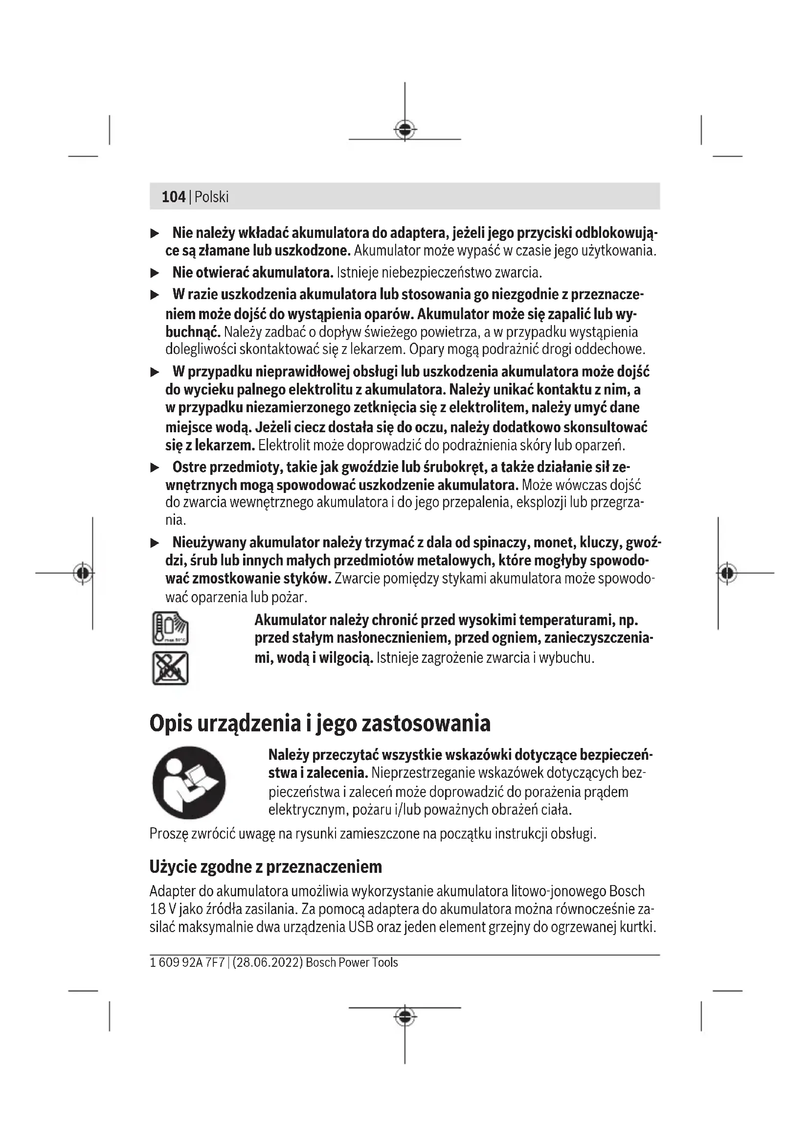 Karasoku Mahallesi 28028. Sokak No:20/A Merkez / ADANA Tel.: +903223599710 -3521379 Fax: +903223591323 E-mail: isiklar@isiklarelektrik.com Diğer servis adreslerini şurada bulabilirsiniz: www.bosch-pt.com/serviceaddresses Nakliye Lityum iyon aküler tehlikeli madde taşıma yönetmeliğine tabidir. Aküler başka bir yükümlülük olmaksızın kullanıcı tarafından caddeler üzerinde taşınabilir. Üçüncü kişiler eliyle yollanma durumunda (örneğin hava yolu ile veya nakliye şirketleri ile) paketleme ve etiketlemeye ilişkin özel hükümlere uyulmalıdır. Gönderi paketlenirken bir tehlikeli madde uzmanından yardım alınmalıdır. Aküleri sadece ve ancak gövdelerinde hasar yoksa gönderin. Açık kontakları kapatın ve aküyü ambalaj içinde hareket etmeyecek biçimde paketleyin. Lütfen olası ek ulusal yönetmelik hükümlerine de uyun. 1 609 92A 7F7 | (28.06.2022) Bosch Power ToolsPolski | 103 Tasfiye Elektrikli el aletleri, aküler/piller, aksesuar ve ambalaj malzemesi çevre dostu tasfiye amacıyla bir geri kazanım merkezine yollanmalıdır. Bahçe aletlerini ve aküleri/pilleri evsel çöplerin içine atmayın! Sadece AB ülkeleri için: Atık elektrikli ve elektronik cihazlara ilişkin 2012/19/EU sayılı Avrupa yönetmeliği ve ulusal hukuktaki uygulaması uyarınca, kullanım ömrünü tamamlamış elektrikli cihazlar ve 2006/66/EC sayılı Avrupa yönetmeliği uyarınca arızalı veya kullanım ömrünü tamamlamış aküler/piller ayrı ayrı toplanmalı ve çevre kurallarına uygun şekilde imha edilmek üzere bir geri dönüşüm merkezine gönderilmelidir. Atık elektrikli ve elektronik ekipmanlar uygun şekilde imha edilmezse olası tehlikeli maddelerin varlığı nedeniyle çevre ve insan sağlığı üzerinde zararlı etkileri olabilir. Aküler/bataryalar: Lityum İyon: Lütfen nakliye (Bakınız „Nakliye“, Sayfa102) bölümündeki talimata uyun. Polski Wskazówki bezpieczeństwa Należy przeczytać wszystkie wskazówki dotyczące bezpieczeń- stwa i zalecenia. Nieprzestrzeganie wskazówek dotyczących bezpie- czeństwa izaleceń może doprowadzić do porażenia prądem elek- trycznym, pożaru i/lub poważnych obrażeń ciała. Należy starannie przechowywać wszystkie wskazówki dotyczące bezpieczeństwa i zalecenia dla dalszego zastosowania. u Należy stosować wyłącznie akumulatory wyszczególnione w danych technicz- nych. Zastosowanie akumulatorów innego typu może spowodować obrażenia oraz grozi pożarem. Bosch Power Tools 1 609 92A 7F7 | (28.06.2022)104 | Polski u Nie należy wkładać akumulatora do adaptera, jeżeli jego przyciski odblokowują- ce są złamane lub uszkodzone. Akumulator może wypaść w czasie jego użytkowania. u Nie otwierać akumulatora. Istnieje niebezpieczeństwo zwarcia. u W razie uszkodzenia akumulatora lub stosowania go niezgodnie z przeznacze- niem może dojść do wystąpienia oparów. Akumulator może się zapalić lub wy- buchnąć. Należy zadbać o dopływ świeżego powietrza, a w przypadku wystąpienia dolegliwości skontaktować się z lekarzem. Opary mogą podrażnić drogi oddechowe. u W przypadku nieprawidłowej obsługi lub uszkodzenia akumulatora może dojść do wycieku palnego elektrolitu z akumulatora. Należy unikać kontaktu z nim, a wprzypadku niezamierzonego zetknięcia się z elektrolitem, należy umyć dane miejsce wodą. Jeżeli ciecz dostała się do oczu, należy dodatkowo skonsultować się z lekarzem. Elektrolit może doprowadzić do podrażnienia skóry lub oparzeń. u Ostre przedmioty, takie jak gwoździe lub śrubokręt, a także działanie sił ze- wnętrznych mogą spowodować uszkodzenie akumulatora. Może wówczas dojść do zwarcia wewnętrznego akumulatora i do jego przepalenia, eksplozji lub przegrza- nia. u Nieużywany akumulator należy trzymać z dala od spinaczy, monet, kluczy, gwoź- dzi, śrub lub innych małych przedmiotów metalowych, które mogłyby spowodo- wać zmostkowanie styków. Zwarcie pomiędzy stykami akumulatora może spowodo- wać oparzenia lub pożar. Akumulator należy chronić przed wysokimi temperaturami, np. przed stałym nasłonecznieniem, przed ogniem, zanieczyszczenia- mi, wodą i wilgocią. Istnieje zagrożenie zwarcia i wybuchu. Opis urządzenia i jego zastosowania Należy przeczytać wszystkie wskazówki dotyczące bezpieczeń- stwa i zalecenia. Nieprzestrzeganie wskazówek dotyczących bez- pieczeństwa izaleceń może doprowadzić do porażenia prądem elektrycznym, pożaru i/lub poważnych obrażeń ciała. Proszę zwrócić uwagę na rysunki zamieszczone na początku instrukcji obsługi. Użycie zgodne z przeznaczeniem Adapter do akumulatora umożliwia wykorzystanie akumulatora litowo-jonowego Bosch 18 V jako źródła zasilania. Za pomocą adaptera do akumulatora można równocześnie za- silać maksymalnie dwa urządzenia USB oraz jeden element grzejny do ogrzewanej kurtki. 1 609 92A 7F7 | (28.06.2022) Bosch Power ToolsPolski | 105 Przedstawione graficznie komponenty Numeracja przedstawionych graficznie komponentów odnosi się do schematu elektrona- rzędzia na stronach graficznych. (1) Adapter do akumulatora (2) Gniazdo USB (3) Gniazdo do podłączenia wtyczki elementu grzejnego ogrzewanej kurtki (4) Zaczep do paska (5) Włącznik do aktywacji adaptera do akumulatora (6) Akumulator
