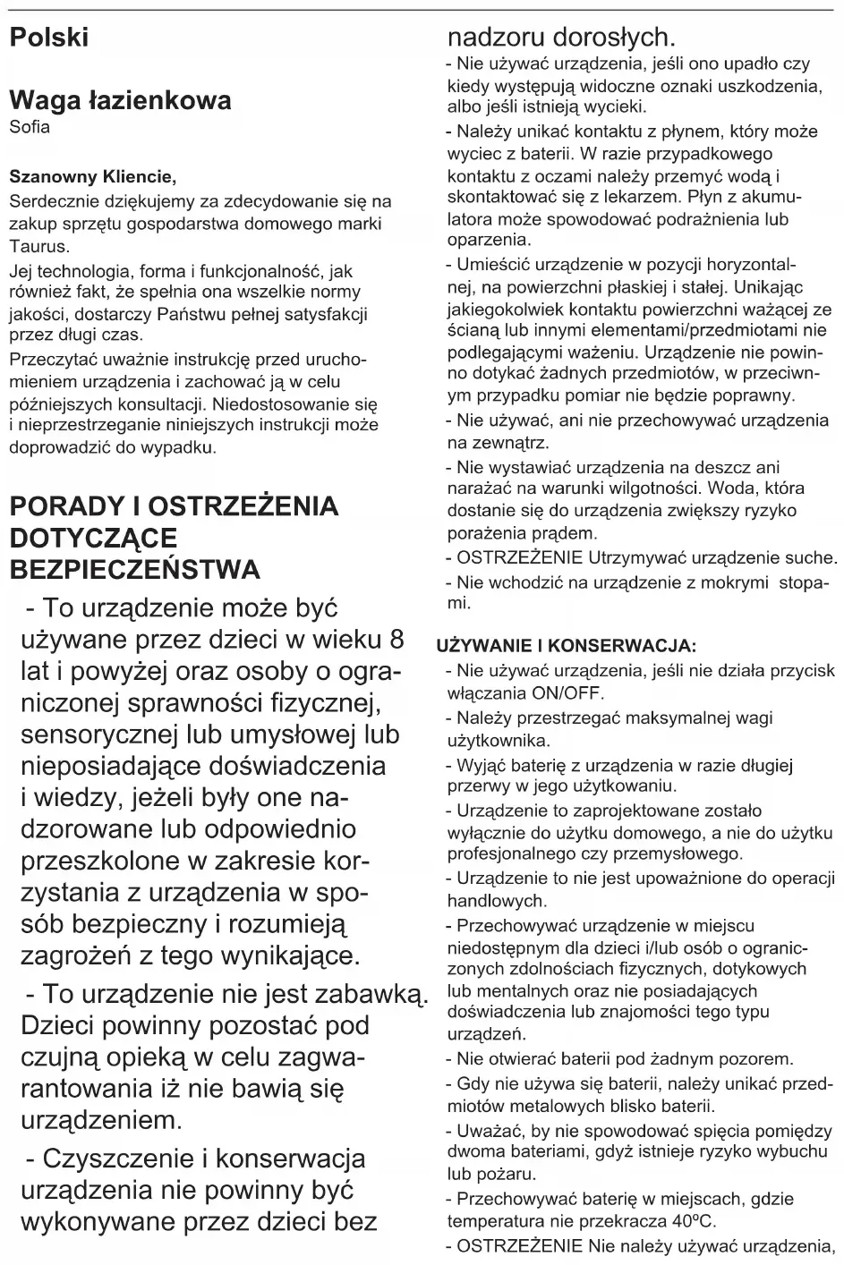 - Materiały, z których wykonane jest opakowa- nie tego urządzenia, znajdują się w ramach systemu zbierania, klasykacji oraz ich odzysku. Jeżeli chcecie Państwo się ich pozbyć, należy umieścić je w kontenerze przeznaczonym do tego typu materiałów. - Produkt nie zawiera koncentracji substancji, które mogłyby być uznane za szkodliwe dla środowiska. Symbol ten oznacza, że jeśli chcecie się Państwo pozbyć tego produktu po zakończeniu okresu jego użytkowania, należy go przekazać przy zastosowaniu określonych środków do autoryzowanego podmiotu zarządzającego odpadami w celu przeprowadzenia selektywnej zbiórki Odpadów Urządzeń Elektrycznych i Elektronicznych (WEEE). Symbol ten oznacza, że produkt może posiadać wewnątrz baterie lub akumula- tory, które to powinny zostać uprzednio wyjęte przed pozbyciem się produktu. Pamiętać należy, że baterie/akumulatory powinny zostać złożone w specjalnych autoryzowanych kontenerach. I nie mogą być one nigdy wrzucane do ognia. Urządzenie spełniające wymogi Ustawy 2014/30/ EU o Zgodności Elektromagnetycznej i Ustawy 2011/65/EU w sprawie ograniczenia stosowania niektórych niebezpiecznych substancji w sprzęcie elektrycznym i elektronicznym.Ελληνικά Ζυγαριά μπάνιου Soa Αξιότιμε πελάτη: Σας ευχαριστούμε που αποφασίσατε να αγοράσετε ένα προϊόν μάρκας Taurus. Η τεχνολογία, ο σχεδιασμός και η λειτουργία του, σε συνδυασμό με το γεγονός ότι το προϊόν πληροί τις αυστηρότερες προδιαγραφές ποιότητας θα σας εξασφαλίσουν πλήρη ικανοποίηση για πολύ