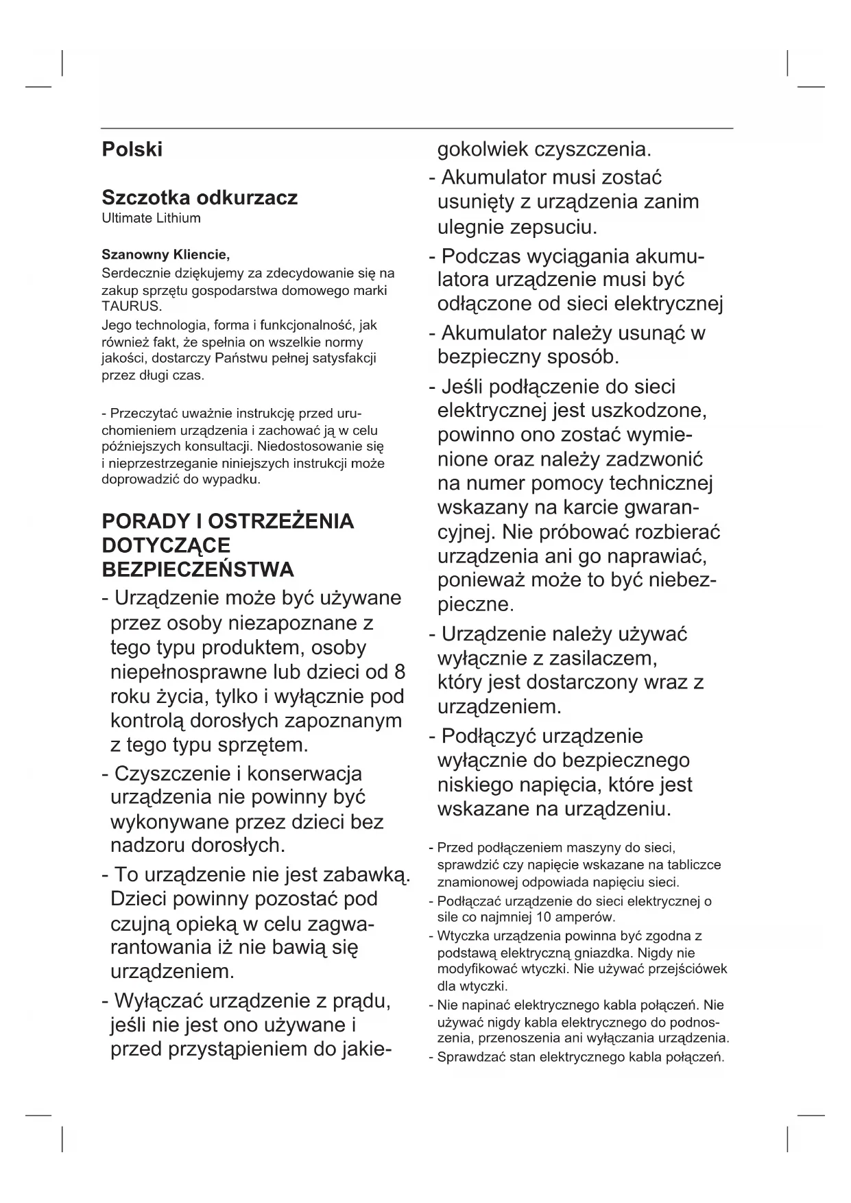 Ultimate Lithium - Odkurzacz TAURUS - Bezpłatna instrukcja obsługi