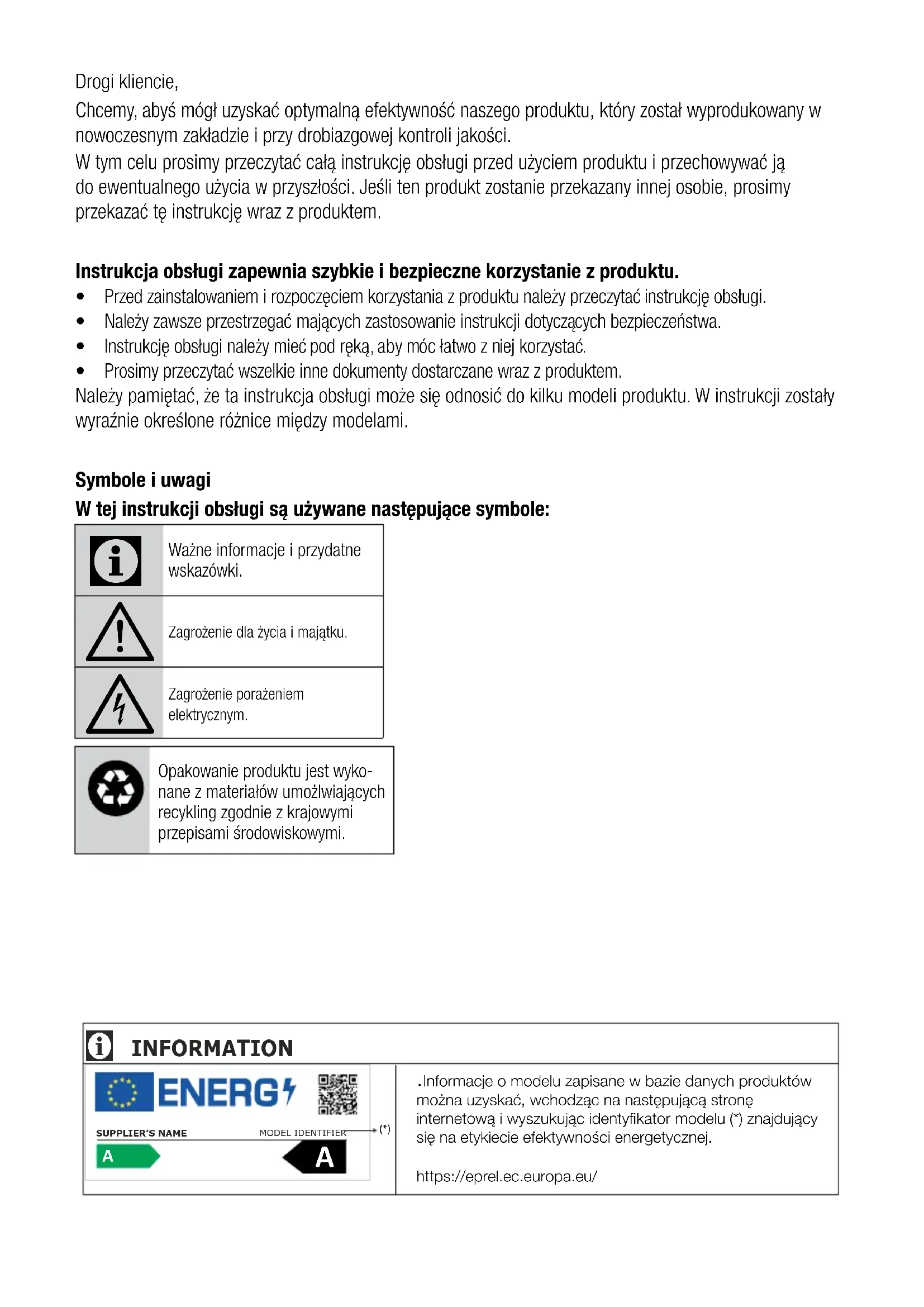 Ważne informacje i przydatne wskazówki. Zagrożenie dla życia i majątku. Zagrożenie porażeniem elektrycznym.Opakowanie produktu jest wyko-nane z materiałów umożlwiających recykling zgodnie z krajowymi przepisami środowiskowymi. .Informacje o modelu zapisane w bazie danych produktów można uzyskać, wchodząc na następującą stronę internetową i wyszukując identyfikator modelu (*) znajdujący się na etykiecie efektywności energetycznej.https://eprel.ec.europa.eu/