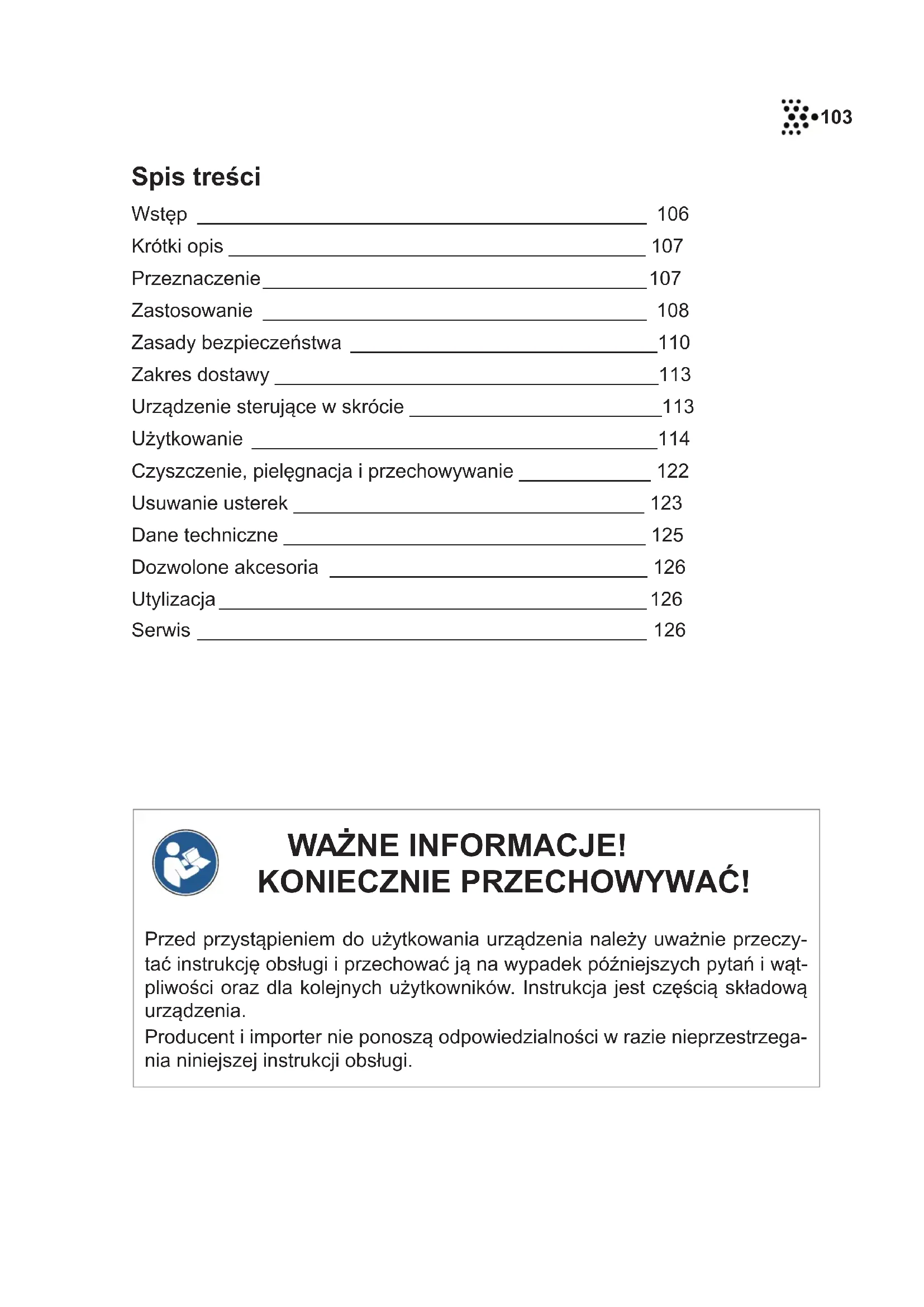 Poprzez oznaczenie tym symbolem wytwórca lub importer potwierdza, że wyrób jest zgodny z odpowiednimi dyrektywami UE oraz z określonymi w nich „wymaganiami zasadniczymi”. Numer 0123 odnosi się do podanej jednostki certyfi kującej. Razem po- świadczają one, że osoba odpowie- dzialna za wprowadzenie produktu do obrotu stosuje się do przepisów Ustawy o wyrobach medycznych (UWM). Objaśnienie haseł ostrzegawczych ZAGROŻENIE Ostrzega przed poważnymi urazami i śmiertelnym zagro- żeniem OSTRZEŻENIE ostrzega przed potencjalnymi po- ważnymi urazami i śmiertelnym nie- bezpieczeństwem UWAGA Ostrzega przed obrażeniami w stop- niu od lekkiego do średniego INFORMACJA Ostrzega przed szkodami materialnymi105 Szanowni Klienci, cieszymy się, że zdecydowaliście się Państwo na