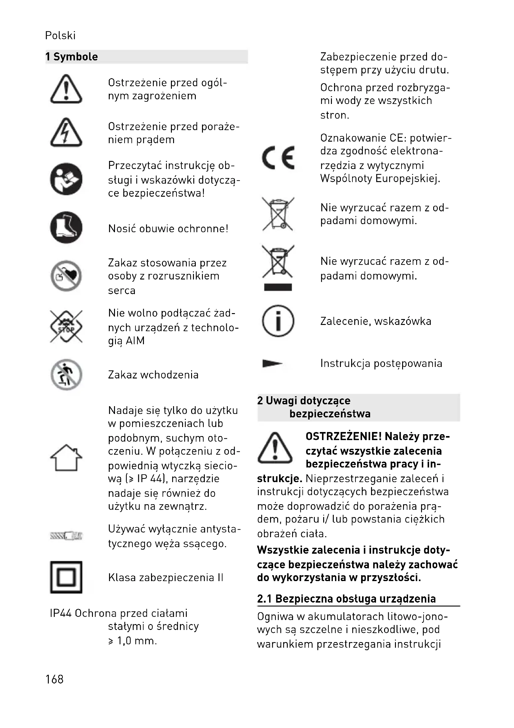 Ogniwa w akumulatorach litowo-jono wych są szczelne i nieszkodliwe, pod warunkiem przestrzegania instrukcji Polski 168producenta podczas użytkowania i ob sługi.