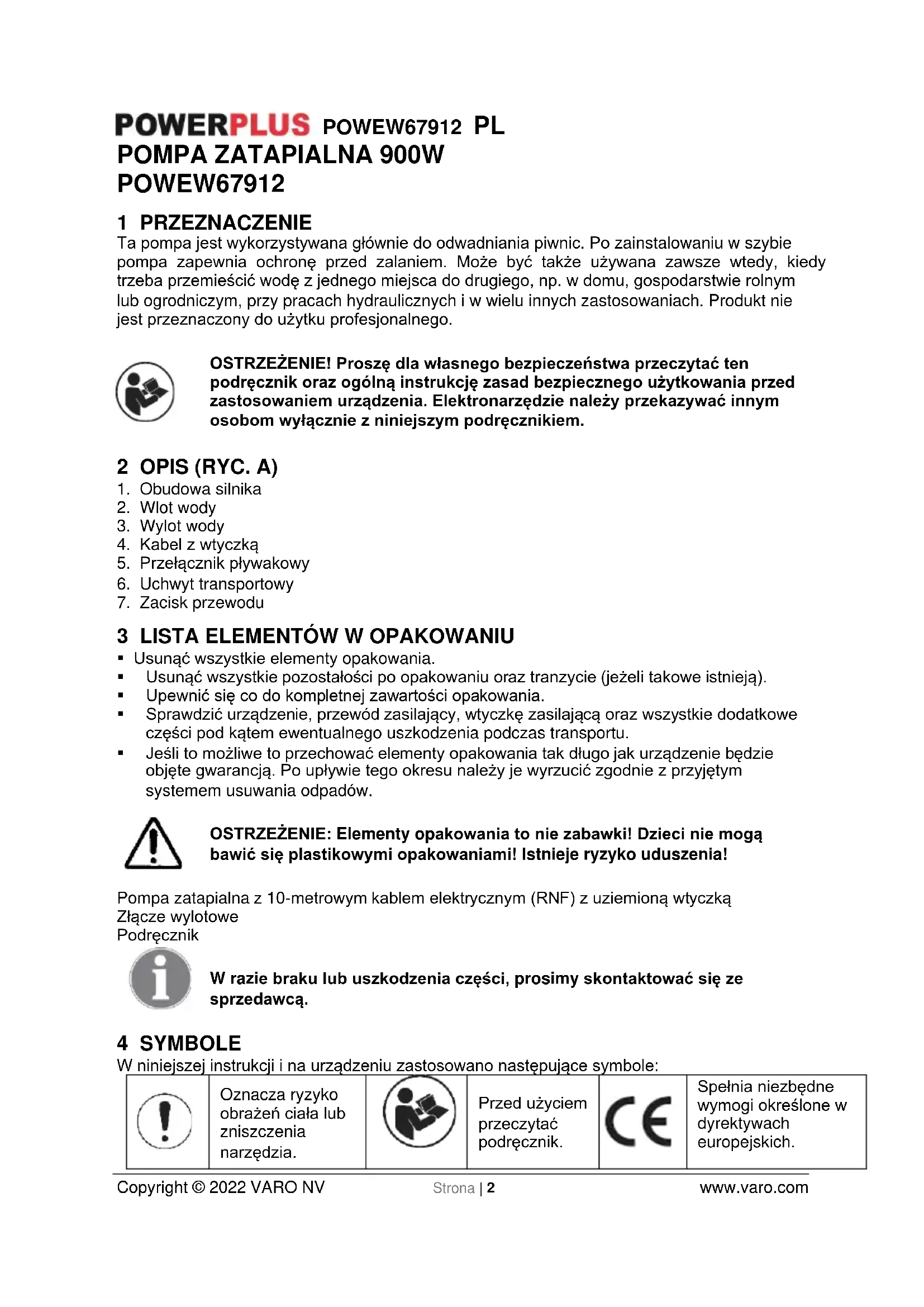 - Ustawiając przełącznik pływakowy, należy się upewnić, że nie dotyka on podstawy zanim pompa się wyłączy. Przestroga! Ryzyko pracy na sucho. To urządzenie nie może być używane przez dzieci ani osoby o upośledzonych bądź nierozwiniętych zdolnościach fizycznych lub umysłowych, a także przez osoby bez odpowiedniego doświadczenia lub wiedzy, o ile nie zostaną one odpowiednio poinstruowane - przez osobę odpowiedzialną za ich bezpieczeństwo lub brygadzistę - albo jeśli nie zaznajomią się z wyżej podanymi instrukcjami użycia tego urządzenia.POWEW67912 PL Copyright © 2022 VARO NV Strona | 5 www.varo.com