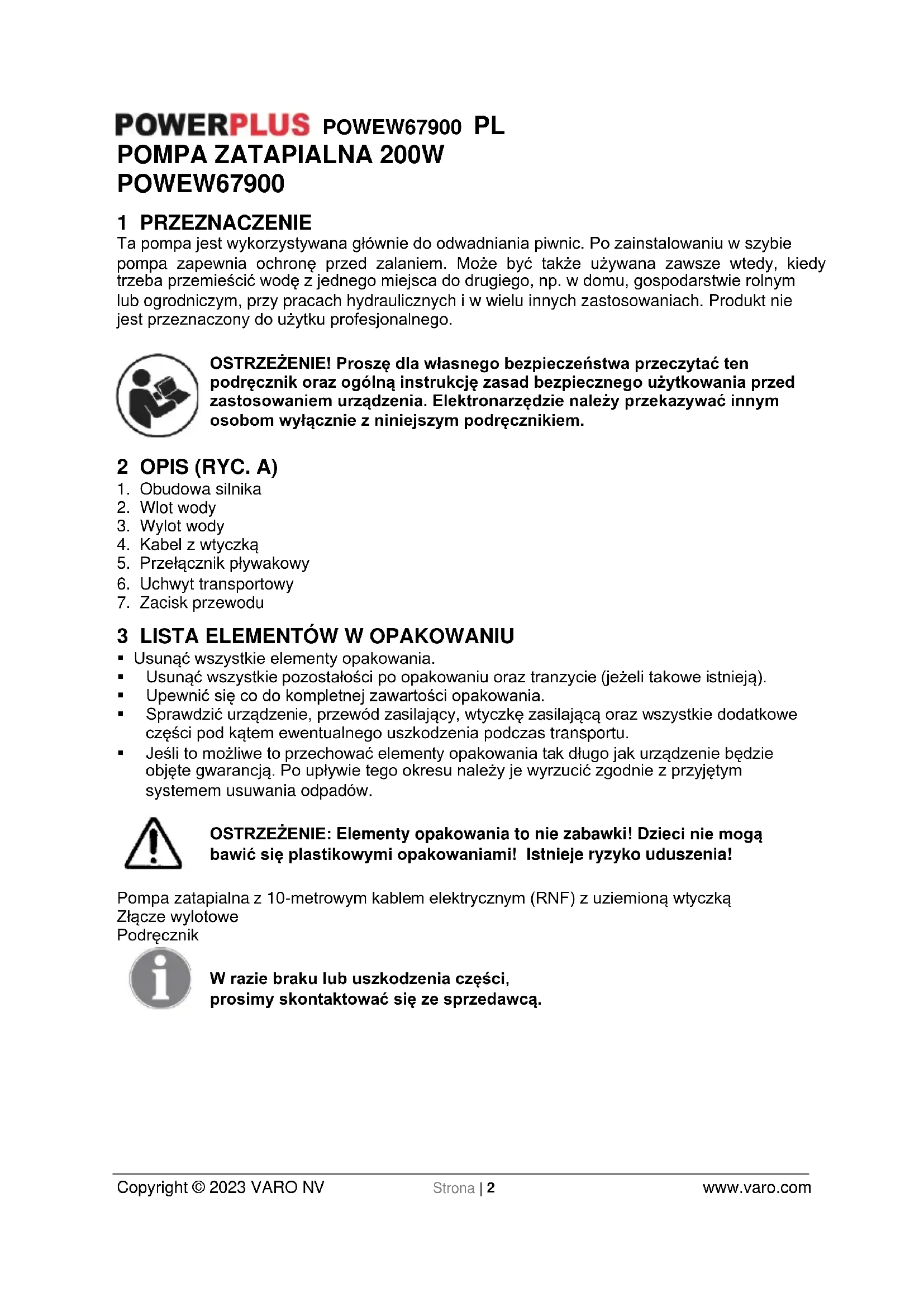 - Jeśli to możliwe to przechować elementy opakowania tak długo jak urządzenie będzie objęte gwarancją. Po upływie tego okresu należy je wyrzucić zgodnie z przyjętym systemem usuwania odpadów. OSTRZEŻENIE: Elementy opakowania to nie zabawki! Dzieci nie mogą bawić się plastikowymi opakowaniami! Istnieje ryzyko uduszenia! Pompa zatapialna z 10-metrowym kablem elektrycznym (RNF) z uziemioną wtyczką Złącze wylotowe Podręcznik W razie braku lub uszkodzenia części, prosimy skontaktować się ze sprzedawcą.POWEW67900 PL Copyright © 2023 VARO NV Strona | 3 www.varo.com 4 SYMBOLE W niniejszej instrukcji i na urządzeniu zastosowano następujące symbole: