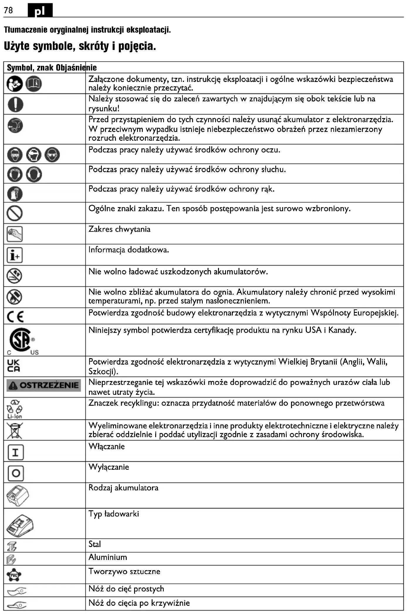 Tłumaczenie oryginalnej instrukcji eksploatacji. Użyte symbole, skróty i pojęcia. Symbol, znak Objaśnienie Załączone dokumenty, tzn. instrukcję eksploatacji i ogólne wskazówki bezpieczeństwa należy koniecznie przeczytać. Należy stosować się do zaleceń zawartych w znajdującym się obok tekście lub na rysunku! Przed przystąpieniem do tych czynności należy usunąć akumulator z elektronarzędzia. W przeciwnym wypadku istnieje niebezpieczeństwo obrażeń przez niezamierzony rozruch elektronarzędzia. Podczas pracy należy używać środków ochrony oczu. Podczas pracy należy używać środków ochrony słuchu. Podczas pracy należy używać środków ochrony rąk. Ogólne znaki zakazu. Ten sposób postępowania jest surowo wzbroniony. Zakres chwytania Informacja dodatkowa. Nie wolno ładować uszkodzonych akumulatorów. Nie wolno zbliżać akumulatora do ognia. Akumulatory należy chronić przed wysokimi temperaturami, np. przed stałym nasłonecznieniem. Potwierdza zgodność budowy elektronarzędzia z wytycznymi Wspólnoty Europejskiej. Niniejszy symbol potwierdza certyfikację produktu na rynku USA i Kanady. Potwierdza zgodność elektronarzędzia z wytycznymi Wielkiej Brytanii (Anglii, Walii, Szkocji). Nieprzestrzeganie tej wskazówki może doprowadzić do poważnych urazów ciała lub nawet utraty życia. Znaczek recyklingu: oznacza przydatność materiałów do ponownego przetwórstwa Wyeliminowane elektronarzędzia i inne produkty elektrotechniczne i elektryczne należy zbierać oddzielnie i poddać utylizacji zgodnie z zasadami ochrony środowiska. Włączanie Wyłączanie Rodzaj akumulatora Typ ładowarki Stal Aluminium Tworzywo sztuczne Nóż do cięć prostych Nóż do cięcia po krzywiźnie79
