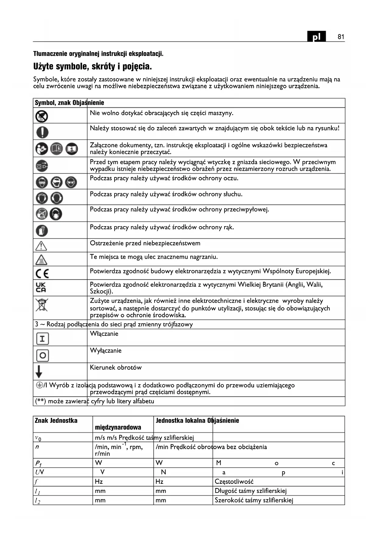 Tłumaczenie oryginalnej instrukcji eksploatacji. Użyte symbole, skróty i pojęcia. Symbole, które zostały zastosowane w niniejszej instrukcji eksploatacji oraz ewentualnie na urządzeniu mają na celu zwrócenie uwagi na możliwe niebezpieczeństwa związane z użytkowaniem niniejszego urządzenia. Symbol, znak Objaśnienie Nie wolno dotykać obracających się części maszyny. Należy stosować się do zaleceń zawartych w znajdującym się obok tekście lub na rysunku! Załączone dokumenty, tzn. instrukcję eksploatacji i ogólne wskazówki bezpieczeństwa należy koniecznie przeczytać. Przed tym etapem pracy należy wyciągnąć wtyczkę z gniazda sieciowego. W przeciwnym wypadku istnieje niebezpieczeństwo obrażeń przez niezamierzony rozruch urządzenia. Podczas pracy należy używać środków ochrony oczu. Podczas pracy należy używać środków ochrony słuchu. Podczas pracy należy używać środków ochrony przeciwpyłowej. Podczas pracy należy używać środków ochrony rąk. Ostrzeżenie przed niebezpieczeństwem Te miejsca te mogą ulec znacznemu nagrzaniu. Potwierdza zgodność budowy elektronarzędzia z wytycznymi Wspólnoty Europejskiej. Potwierdza zgodność elektronarzędzia z wytycznymi Wielkiej Brytanii (Anglii, Walii, Szkocji). Zużyte urządzenia, jak również inne elektrotechniczne i elektryczne wyroby należy sortować, a następnie dostarczyć do punktów utylizacji, stosując się do obowiązujących przepisów o ochronie środowiska. 3 ~ Rodzaj podłączenia do sieci prąd zmienny trójfazowy Włączanie Wyłączanie Kierunek obrotów /I Wyrób z izolacją podstawową i z dodatkowo podłączonymi do przewodu uziemiającego przewodzącymi prąd częściami dostępnymi. (**) może zawierać cyfry lub litery alfabetu Znak Jednostka międzynarodowa Jednostka lokalna Objaśnienie