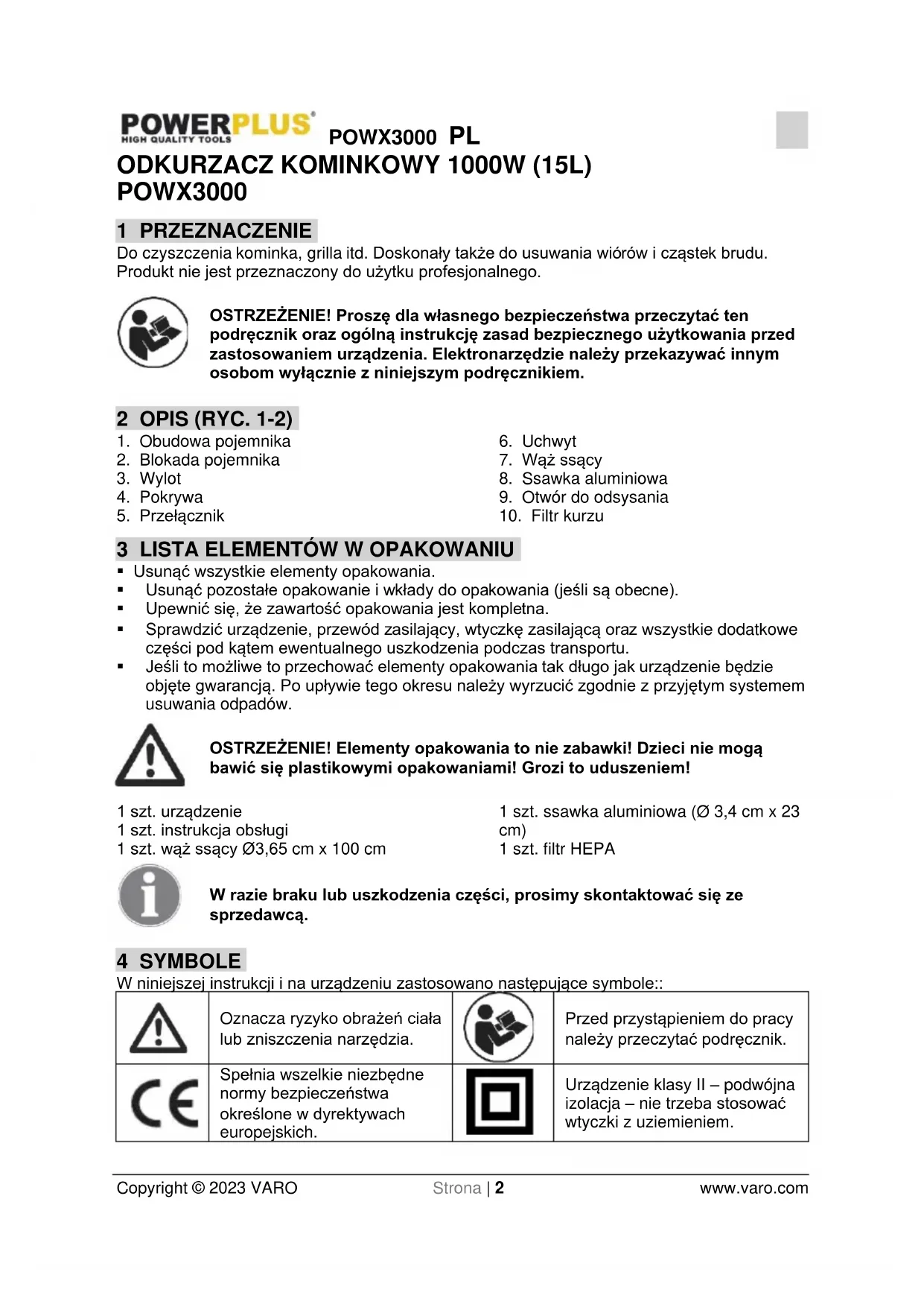 Copyright © 2023 VARO Strona | 2 www.varo.com ODKURZACZ KOMINKOWY 1000W (15L) POWX3000 1 PRZEZNACZENIE Do czyszczenia kominka, grilla itd. Doskonały także do usuwania wiórów i cząstek brudu. Produkt nie jest przeznaczony do użytku profesjonalnego. OSTRZEŻENIE! Proszę dla własnego bezpieczeństwa przeczytać ten podręcznik oraz ogólną instrukcję zasad bezpiecznego użytkowania przed zastosowaniem urządzenia. Elektronarzędzie należy przekazywać innym osobom wyłącznie z niniejszym podręcznikiem. 2 OPIS (RYC. 1-2)