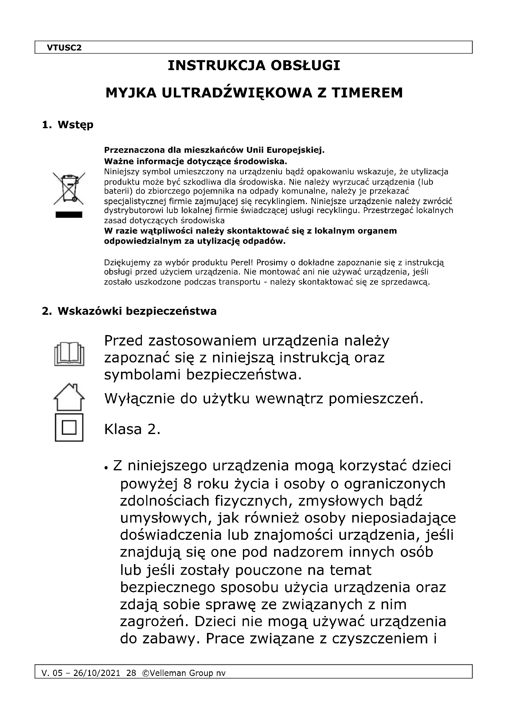 VTUSC2 - Czyścik ultradźwiękowy Perel - Bezpłatna instrukcja obsługi