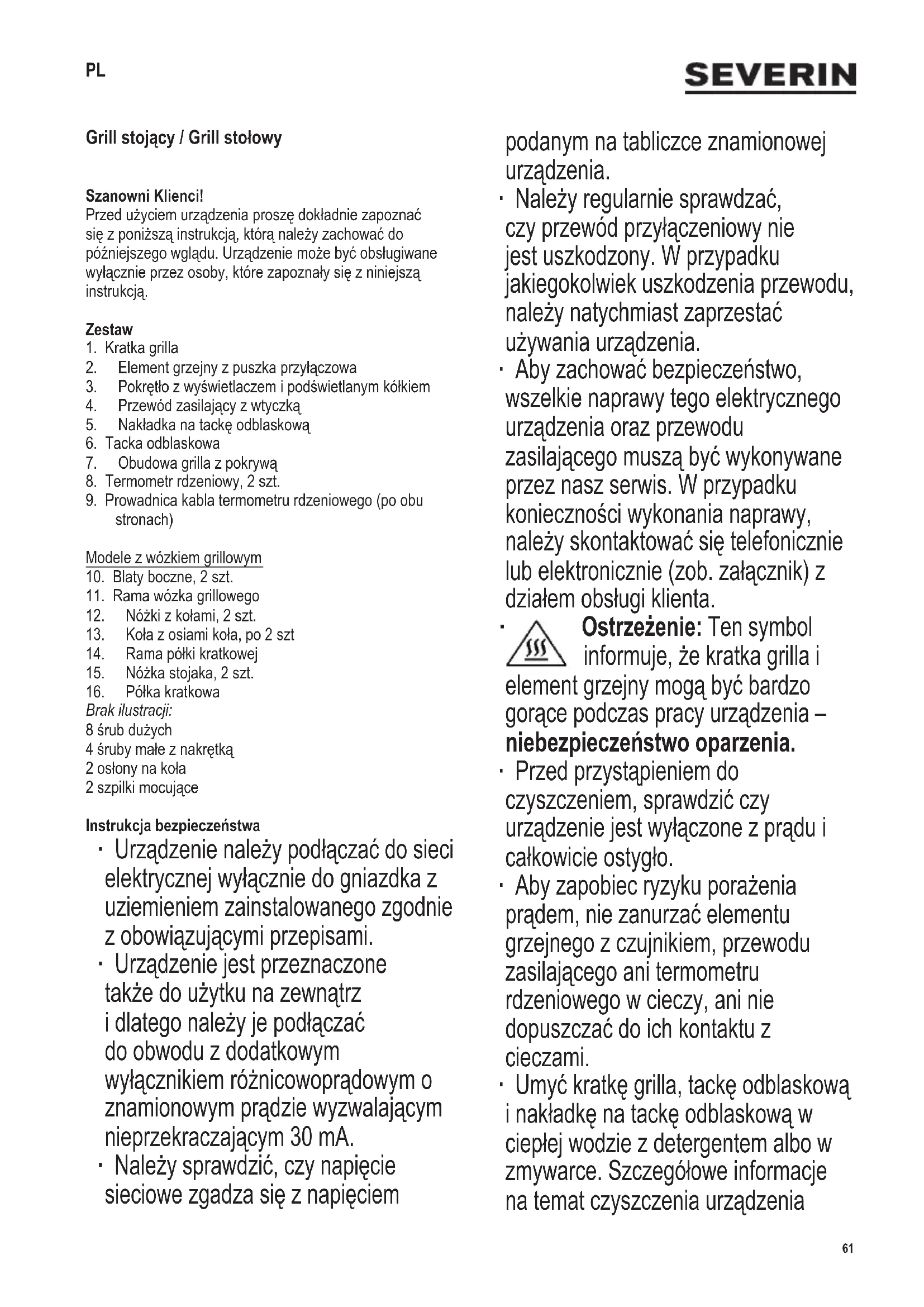 Ostrzeżenie: Ten symbol informuje,żekratkagrillai elementgrzejnymogąbyćbardzo gorącepodczaspracyurządzenia– niebezpieczeństwo oparzenia. ∙ Przedprzystąpieniemdo czyszczeniem,sprawdzićczy urządzeniejestwyłączonezprądui całkowicieostygło. ∙ Abyzapobiecryzykuporażenia prądem,niezanurzaćelementu grzejnego z czujnikiem, przewodu zasilającegoanitermometru rdzeniowego w cieczy, ani nie dopuszczaćdoichkontaktuz cieczami. ∙ Umyćkratkęgrilla,tackęodblaskową inakładkęnatackęodblaskowąw ciepłejwodziezdetergentemalbow zmywarce.Szczegółoweinformacje natematczyszczeniaurządzenia PL62 142 x 208 mm znajdująsięwpunkcieCzyszczenie i konserwacja. ∙ Urządzenieniejestprzystosowane do bycia uruchamianym przy użyciuzewnętrznegoczasomierza lubodrębnegosystemuzdalnego sterowania. ∙ Ostrzeżenie!Wżadnymwypadkunie stosowaćwęgladrzewnegolubinnego stałegobądźciekłegopaliwa. ∙ Ostrzeżenie: Nieprzykrywaćsiatki grillaaluminiowąfolią,naczyniamido „Barbecue” czy innymi przedmiotami, gdyżgromadzącesiępodnią ciepłomożespowodowaćpoważne uszkodzenieurządzenia. ∙ Dotackiodblaskowejmożnawlać maksymalnie 2,0 l wody. ∙ Urządzenieprzeznaczonejest dozastosowańdomowychlub podobnych, jak np. w - kuchniach biurowych lub innych miejscach pracy; - agroturystyce; - hotelach, motelach itp. oraz innych podobnych lokalach (przez klientów); - pensjonatach. ∙ Osobyoograniczonychzdolnościach zycznych,czuciowychlub psychicznychalbonieposiadające stosownegodoświadczenialub wiedzy,atakżedzieci(wwiekuco najmniej8lat),mogąkorzystać zurządzenia,podwarunkiemże znajdująsiępodnadzoremlubzostały poinstruowane,jakużywaćurządzenia isąwpełniświadomewszelkich zagrożeńiwymaganychśrodków ostrożności. ∙ Niedopuszczaćdoużywania urządzeniajakozabawkiprzezdzieci. ∙ Niewolnopozwalaćdzieciom na wykonywanie jakichkolwiek praczwiązanychbezpośrednio zkonserwacjąlubczyszczeniem urządzenia,ajeżelijuż,todziecko musimiećconajmniej8latibyć nadzorowaneprzezosobędorosłą. ∙ Niedopuszczaćdourządzeniaijego przewoduzasilającegodzieciponiżej 8 lat. ∙ Ostrzeżenie: Niepozwalać,abydziecimiałydostęp doelementówopakowania,ponieważmogąone spowodowaćzagrożenie,np.uduszenia. ∙ Przedużyciemurządzenianależydokładniesprawdzić, czygłównykorpusiwszystkieelementyczynnościowe sąsprawneinienosząśladówuszkodzenia.Jeżeli urządzeniespadłonatwardąpowierzchnię,nienadaje siędodalszegoużytku,gdyżnawetnajmniejsza, niewidocznausterkapowstałaztegopowodu,może miećujemnywpływnajegodziałanieibezpieczeństwo użytkownika. ∙ Wczasiepracy,urządzeniemusibyćumieszczonena powierzchni odpornej na wysokie temperatury, plamy irozgrzanytłuszcz.Podczasopiekaniażywnościz dużązawartościątłuszczuniezawszemożnauniknąć odprysków. ∙ Niestawiaćgrillawrogu,aninieopieraćgoościanę. Upewnićsię,czywpobliżunieznajdująsiężadne materiałyłatwopalne. ∙ Żywnośćzdużązawartościątłuszczumożesięzapalić; dlatego przed użyciem zawsze należy najpierw napełnić tackę odblaskową. Nie podłączać grilla do zasilania, dopóki tacka nie zostanie napełniona wodą. Woda pomaga schłodzićtackęodblaskową, zapobieganadmiernemudymieniuiułatwiapóźniej czyszczenieurządzenia. ∙ Należynadzorowaćpoziomwody.Wodęnależydolewać zodpowiednimwyprzedzeniem,pamiętając,abynie zetknęłasięonazelementemgrzejnym. Ostrzeżenie: Przedprzystąpieniemdodolewaniawody,odłączyć grilla od zasilania. ∙ Przed użyciem grilla zawsze sprawdzić, czy element grzejny jest prawidłowo zamocowany w obudowie i tacce odblaskowej. ∙ Nie pozostawiać włączonego urządzenia bez nadzoru. ∙ Należyuważać,abyprzewódzasilającyniedotykał żadnychgorącychelementów.63 142 x 208 mm ∙ Poprowadzićprzewódwtakisposób,abyniktniemógł sięoniegopotknąć. ∙ Wtyczkę należy wyjmować z gniazdka każdorazowo: - przed przystąpieniem do wlewania wody do tacki odblaskowej; - po zakończeniu pracy; - w przypadku stwierdzenia awarii urządzenia; - i przed przystąpieniem do czyszczenia. ∙ Użycieprzedłużaczalubszpulipowodujeutratęmocy, częstopołączonąznagrzewaniemsięprzewodów. Dlategoprzedużyciemnależycałkowicierozwinąć przewód.Sprawdzić,czyprzewódjestprzeznaczonydo użytkunazewnątrzidookreślonejmocy(zob.etykieta znamionowa). ∙ Nie próbować przestawiać wózka grillowego popychając boczny blat. Najpierw zdjąć blaty i zawsze chwytać z ramę wózka. ∙ Nie przewozić wózkiem grillowym żadnych innych przedmiotów. ∙ Nigdynieprzenosićgrillawtrakciejegopracy. ∙ Poużyciuusunąćwodę. ∙ Uwaga!Zawszezaczekaćnazupełneostygnięciegrilla przed jego przenoszeniem, czyszczeniem, przykryciem lub schowaniem. ∙ Uwaga! Jeśli grill nie jest używany, wyjąć element grzewczy wraz ze skrzynką zaciskową z grilla i przechowywać go w suchym pomieszczeniu. ∙ Niedozwolonejestprzechowywanieinnychczęścigrilla nazewnątrzlubwotwartychmiejscach,gdziemogąbyć narażonenaniekorzystnewarunkipogodowe. ∙ Grillamożnaużywaćtylkozdostarczonymtermometrem rdzeniowymbądźztermometremSEVERINnrart.ZB