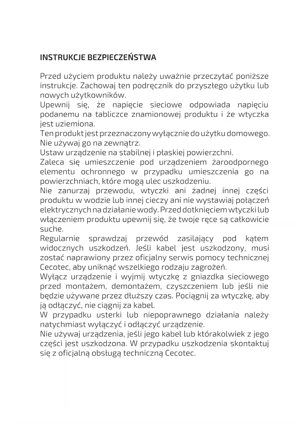 Ten produkt posiada opakowanie zaprojektowane w celu ochronnym podczas transportu. Wyjmij urządzenie z pudełka i zachowaj oryginalne pudełko i inne elementy opakowania w bezpiecznym miejscu. Pomoże Ci to zapobiec uszkodzeniu produktu, jeśli będziesz musiał go przetransportować w przyszłości. Jeśli chcesz pozbyć się oryginalnego opakowania, pamiętaj o prawidłowym recyklingu wszystkich przedmiotów. Upewnij się, że wszystkie części i akcesoria są dołączone i są w dobrym stanie. Jeśli brakuje jakiejkolwiek części lub jest ona w złym stanie, należy natychmiast skontaktować się z oficjalnym serwisem pomocy technicznej Cecotec. Przed pierwszym użyciem dokładnie wyczyść wszystkie części, które mają kontakt ze składnikami, za pomocą gąbki lub miękkiej szmatki. Osuszyć szmatką lub chłonnym papierem. Aby uzyskać najlepsze rezultaty, posmaruj obie płytki niewielką ilością oleju. Ostrzeżenie: Podczas pierwszego użycia żelazka możesz zauważyć lekki zapach spalenizny lub dymu, spowodowany nadmiarem smarów z procesu produkcyjnego. Nie wpływa to na bezpieczeństwo Twojego urządzenia.