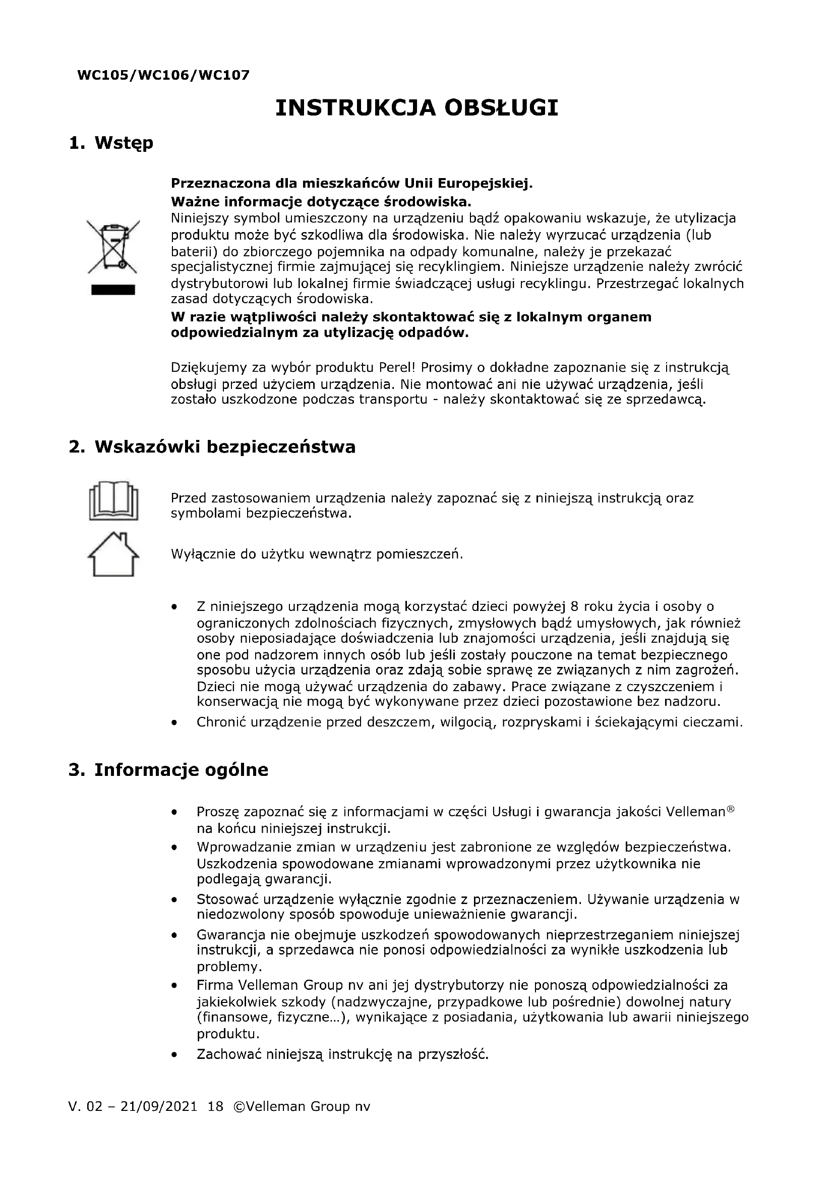 Właścicielem praw autorskich do niniejszej instrukcji jest firma Velleman Group nv. Wszelkie prawa są zastrzeżone na całym świecie. Żadna część niniejszej instrukcji nie może być kopiowana, powielana, tłumaczona ani przenoszona na jakikolwiek nośnik elektroniczny (lub w inny sposób) bez wcześniejszej pisemnej zgody właściciela praw autorskich.WC105/WC106/WC107
