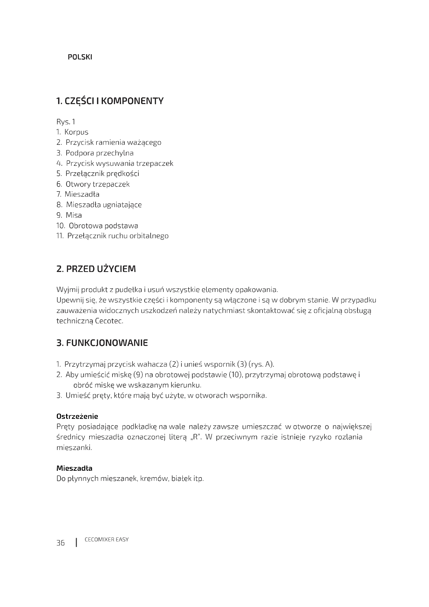 Prosimy o dokładne zapoznanie się z niniejszą instrukcją przed uruchomieniem miksera i zachowanie jej na przyszłość. - To urządzenie może być używane przez osoby o ograniczonych zdolnościach zycznych, sensorycznych lub umysłowych lub bez doświadczenia i wiedzy, jeśli są one nadzorowane lub otrzymały odpowiednie instrukcje dotyczące bezpiecznej obsługi urządzenia i rozumieją związane z tym ryzyko. - To urządzenie nie może być używane przez dzieci. Przechowuj Cecomixer Easy i jego kabel poza ich zasięgiem. - Plastikowe torby i elementy opakowania należy przechowywać poza zasięgiem dzieci. Mogą być potencjalnymi źródłami niebezpieczeństwa. - Nie podłączaj Cecomixer Easy bez upewnienia się, że napięcie wskazane na tabliczce znamionowej urządzenia i Twojego domu jest zgodne. - Nigdy nie zanurzaj korpusu w wodzie ani innych płynach. - To urządzenie zostało zaprojektowane wyłącznie do użytku domowego. Możesz ugniatać do 0,5 kg. Nie należy go utrzymywać w ciągłej pracy dłużej niż 15 minut. - Po tym okresie odstaw na kilka minut przed ponownym użyciem. - Nie pozostawiaj włączonego bez nadzoru. - Nie używaj miksera w próżni. - Należy upewnić się, że dzieci nie bawią się urządzeniem.Trzymaj mikser poza zasięgiem. - Upewnij się, że ani urządzenie, ani przewód nie stykają się z gorącymi powierzchniami lub przedmiotami. - Zawsze odłączaj Cecomixer Easy od sieci zasilającej, kiedy zamierzasz podłączyć lub usunąć którekolwiek z akcesoriów. - Nie pozostawiaj go podłączonego, jeśli nie zamierzasz go używać. - Jeśli przewód zasilający urządzenia ulegnie zniszczeniu, musi zostać wymieniony przez autoryzowany serwis techniczny.