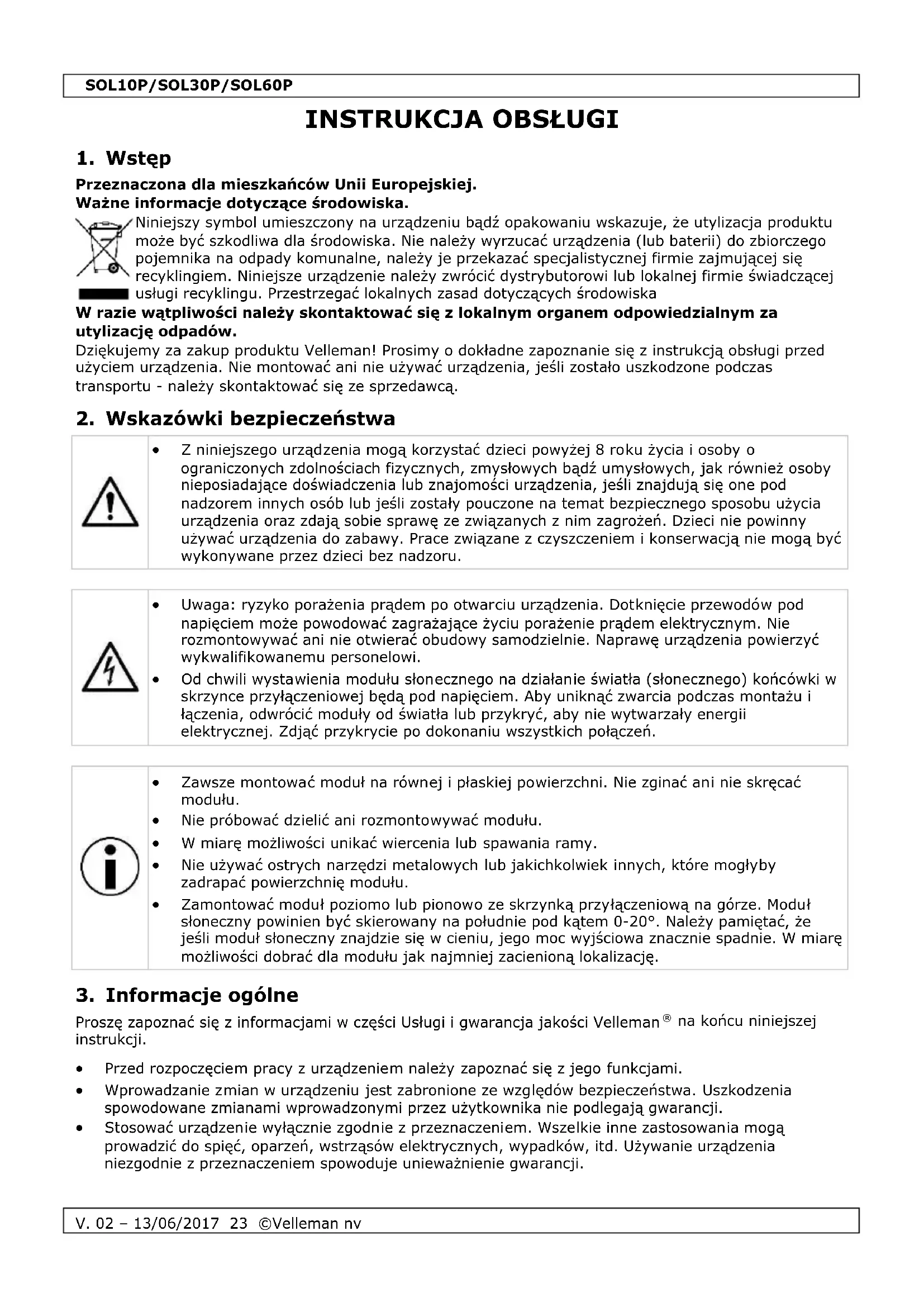 Właścicielem praw autorskich do niniejszej instrukcji jest firma Velleman nv. Wszelkie prawa są zastrzeżone na całym świecie. Żadna część niniejszej instrukcji nie może być kopiowana, powielana, tłumaczona ani przenoszona na jakikolwiek nośnik elektroniczny (lub w inny sposób) bez wcześniejszej pisemnej zgody właściciela praw autorskich.SOL10P/SOL30P/SOL60P
