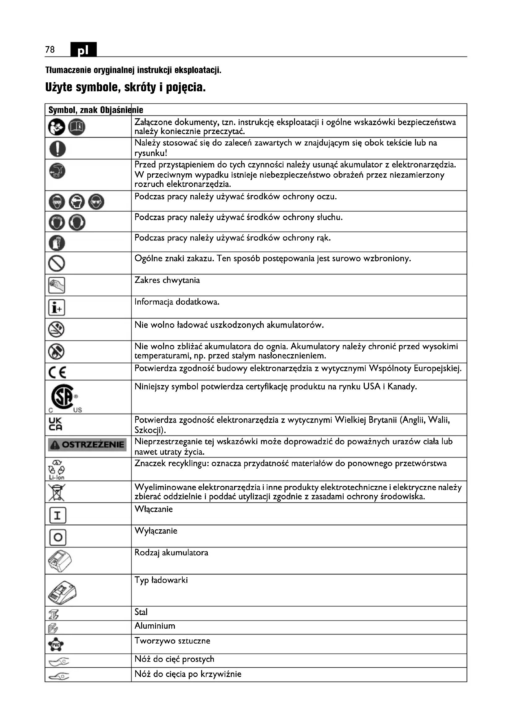 Tłumaczenie oryginalnej instrukcji eksploatacji. Użyte symbole, skróty i pojęcia. Symbol, znak Objaśnienie Załączone dokumenty, tzn. instrukcję eksploatacji i ogólne wskazówki bezpieczeństwa należy koniecznie przeczytać. Należy stosować się do zaleceń zawartych w znajdującym się obok tekście lub na rysunku! Przed przystąpieniem do tych czynności należy usunąć akumulator z elektronarzędzia. W przeciwnym wypadku istnieje niebezpieczeństwo obrażeń przez niezamierzony rozruch elektronarzędzia. Podczas pracy należy używać środków ochrony oczu. Podczas pracy należy używać środków ochrony słuchu. Podczas pracy należy używać środków ochrony rąk. Ogólne znaki zakazu. Ten sposób postępowania jest surowo wzbroniony. Zakres chwytania Informacja dodatkowa. Nie wolno ładować uszkodzonych akumulatorów. Nie wolno zbliżać akumulatora do ognia. Akumulatory należy chronić przed wysokimi temperaturami, np. przed stałym nasłonecznieniem. Potwierdza zgodność budowy elektronarzędzia z wytycznymi Wspólnoty Europejskiej. Niniejszy symbol potwierdza certyfikację produktu na rynku USA i Kanady. Potwierdza zgodność elektronarzędzia z wytycznymi Wielkiej Brytanii (Anglii, Walii, Szkocji). Nieprzestrzeganie tej wskazówki może doprowadzić do poważnych urazów ciała lub nawet utraty życia. Znaczek recyklingu: oznacza przydatność materiałów do ponownego przetwórstwa Wyeliminowane elektronarzędzia i inne produkty elektrotechniczne i elektryczne należy zbierać oddzielnie i poddać utylizacji zgodnie z zasadami ochrony środowiska. Włączanie Wyłączanie Rodzaj akumulatora Typ ładowarki Stal Aluminium Tworzywo sztuczne Nóż do cięć prostych Nóż do cięcia po krzywiźnie79